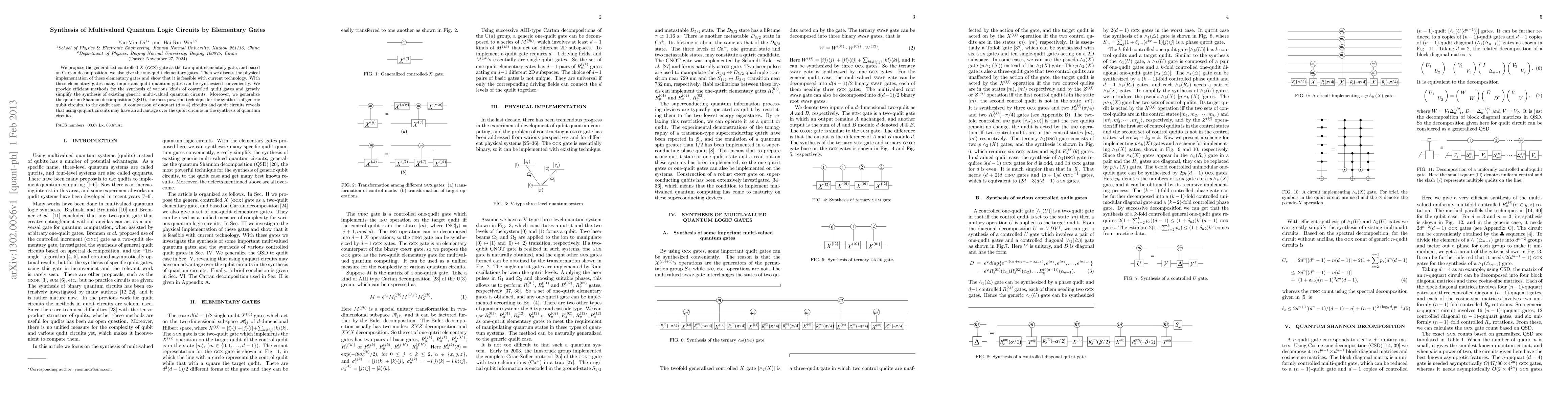 This paper introduces the generalized controlled X (GCX) gate as a fundamental two-qudit gate and presents one-qudit elementary gates based on Cartan decomposition. It discusses their physical feasibility with current technology and proposes efficient methods for synthesizing various controlled qudit gates, simplifying the construction of multi-valued quantum circuits, and generalizes the quantum Shannon decomposition to the qudit case, suggesting potential advantages of qudit circuits over qubit circuits in quantum circuit synthesis.