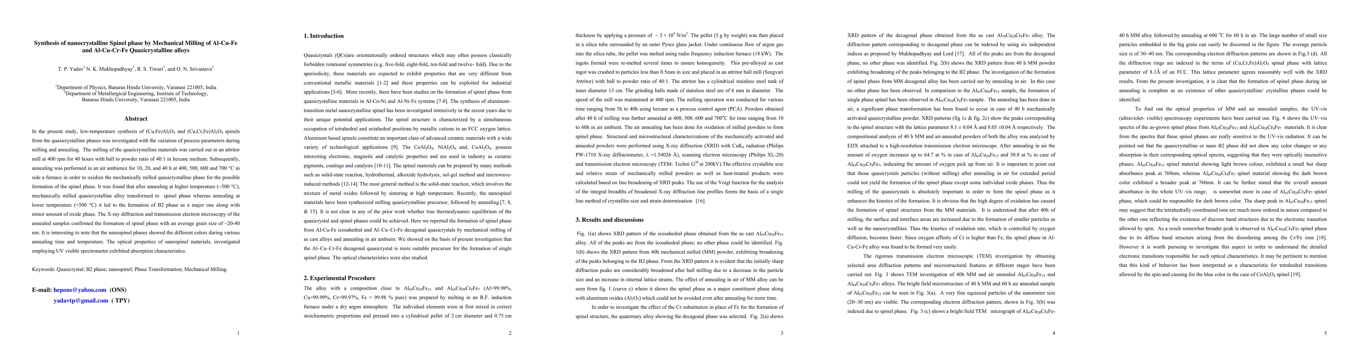 This study investigates the low-temperature synthesis of nanocrystalline spinel phases (CuFe)Al2O4 and (CuCrFe)Al2O4 from quasicrystalline Al-Cu-Fe and Al-Cu-Cr-Fe alloys via mechanical milling and annealing. The mechanically milled quasicrystalline materials transformed to spinel phase upon annealing at 500°C, while lower temperatures resulted in B2 phase formation. The spinel phase exhibited grain sizes of 20-40 nm and varied optical properties depending on annealing conditions.