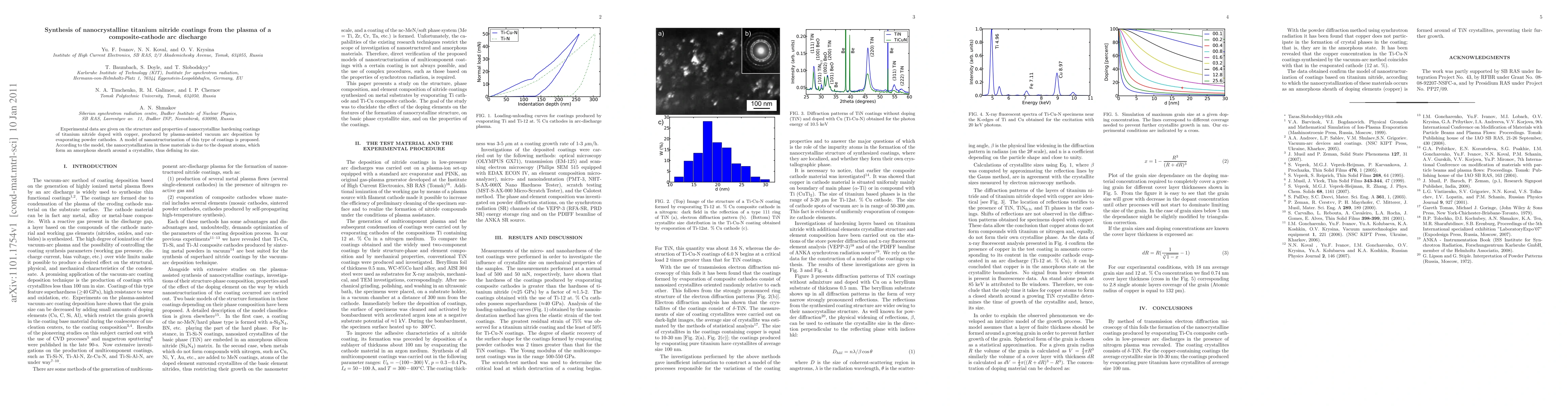 Experimental data are given on the structure and properties of nanocrystalline hardening coatings of titanium nitride doped with copper, produced by plasma-assisted vacuum arc deposition by evaporating powder cathodes. A model of nanostructurization of this type of coatings is proposed. According to the model, the nanocrystallization in these materials is due to the dopant atoms, which form an amorphous sheath around a crystallite, thus defining its size.