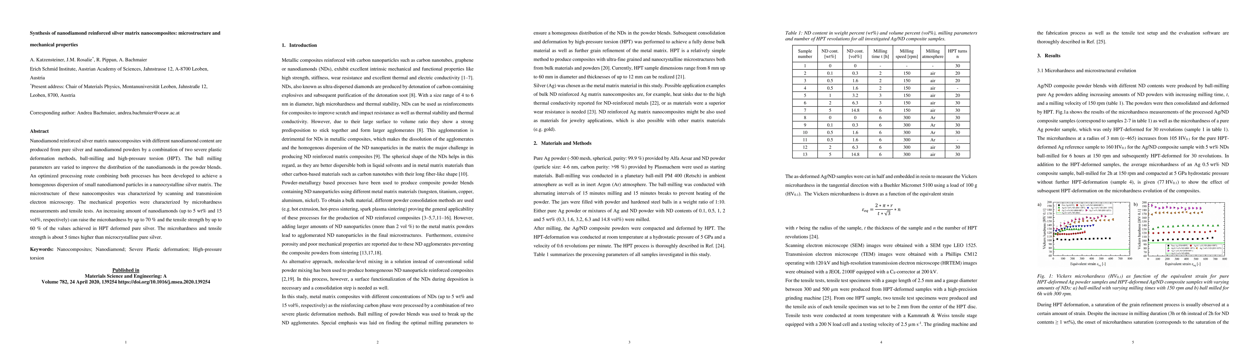 Nanodiamond reinforced silver matrix nanocomposites with different nanodiamond content are produced from pure silver and nanodiamond powders by a combination of two severe plastic deformation methods, ball-milling and high-pressure torsion (HPT). The ball milling parameters are varied to improve the distribution of the nanodiamonds in the powder blends. An optimized processing route combining both processes has been developed to achieve a homogenous dispersion of small nanodiamond particles in a nanocrystalline silver matrix. The microstructure of these nanocomposites was characterized by scanning and transmission electron microscopy. The mechanical properties were characterized by microhardness measurements and tensile tests. An increasing amount of nanodiamonds (up to 5 wt% and 15 vol%, respectively) can raise the microhardness by up to 70 % and the tensile strength by up to 60 % of the values achieved in HPT deformed pure silver. The microhardness and tensile strength is about 5 times higher than microcrystalline pure silver.