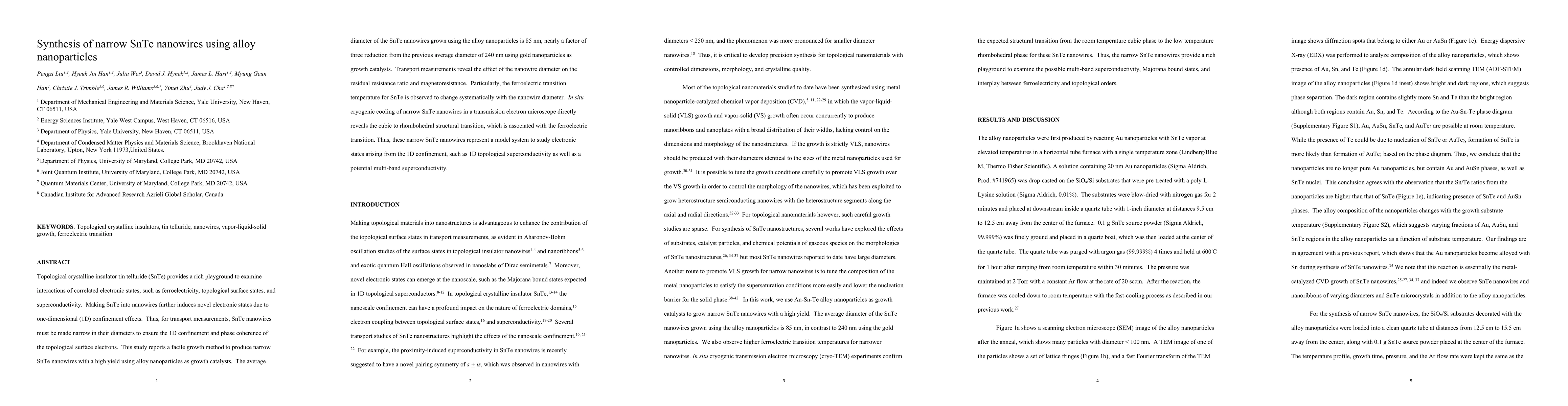 This study presents a method for synthesizing narrow SnTe nanowires using alloy nanoparticles as catalysts, achieving a diameter reduction to 85 nm. The research highlights the impact of nanowire diameter on electronic properties, including ferroelectric transitions and structural changes, making these nanowires ideal for studying 1D topological and multi-band superconductivity.