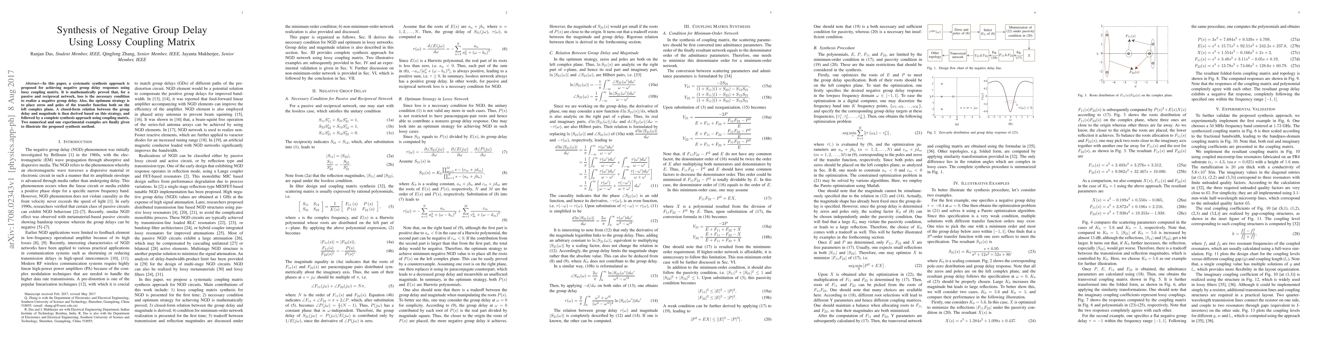 In this paper, a systematic synthesis approach is proposed for achieving negative group delay responses using lossy coupling matrix. It is mathematically proved that, for a passive and reciprocal network, loss is the necessary condition to realize a negative group delay. Also, the optimum strategy is to place zeros and poles of the transfer function both on the left complex plane. A closed-form relation between the group delay and magnitude is then derived based on this strategy, and followed by a complete synthesis approach using coupling matrix. Two numerical and one experimental examples are finally given to illustrate the proposed synthesis method.