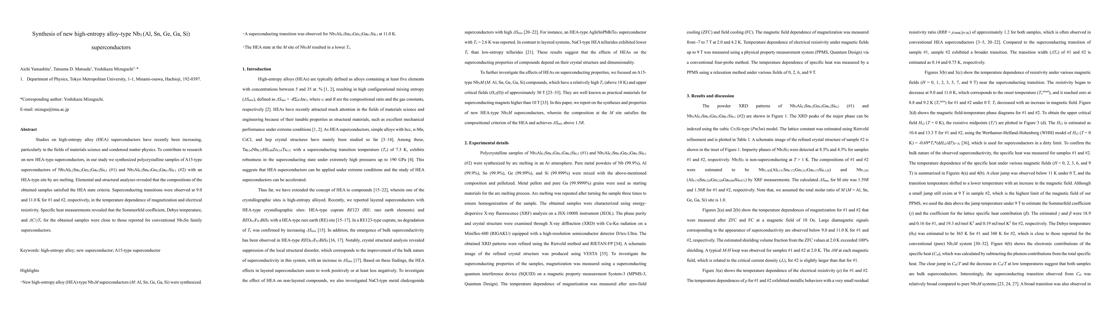 Researchers synthesized two new high-entropy alloy-type superconductors, Nb3Al0.2Sn0.2Ge0.2Ga0.2Si0.2 and Nb3Al0.3Sn0.3Ge0.2Ga0.1Si0.1, with superconducting transitions at 9.0 K and 11.0 K, respectively.