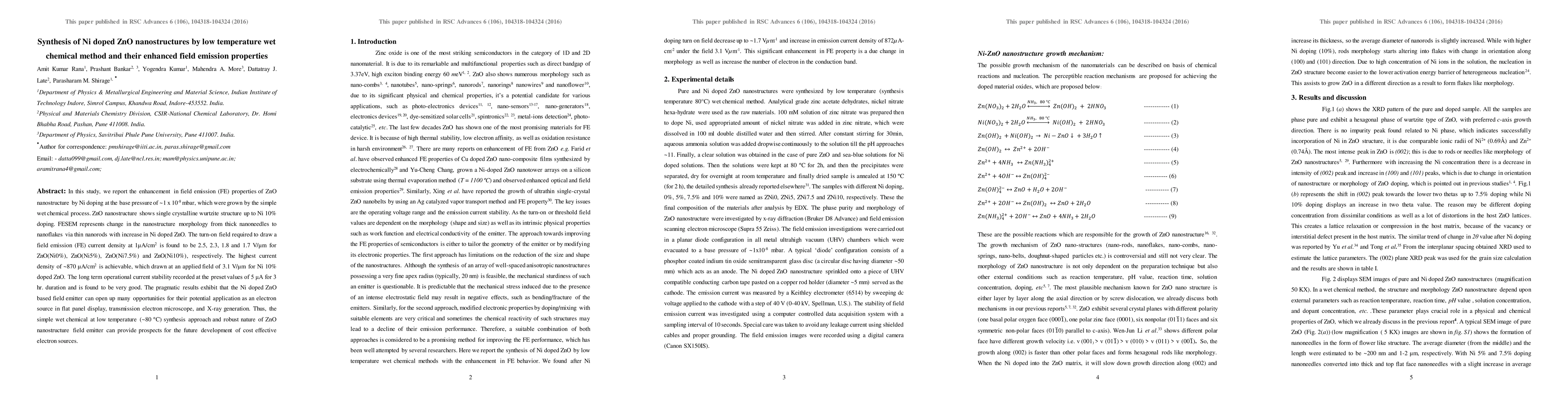 This paper reports the synthesis of Ni-doped ZnO nanostructures via a low-temperature wet chemical method, showing enhanced field emission properties. The turn-on field decreases with Ni doping, indicating improved FE performance, transitioning nanostructure morphology from nanoneedles to nanoflakes.