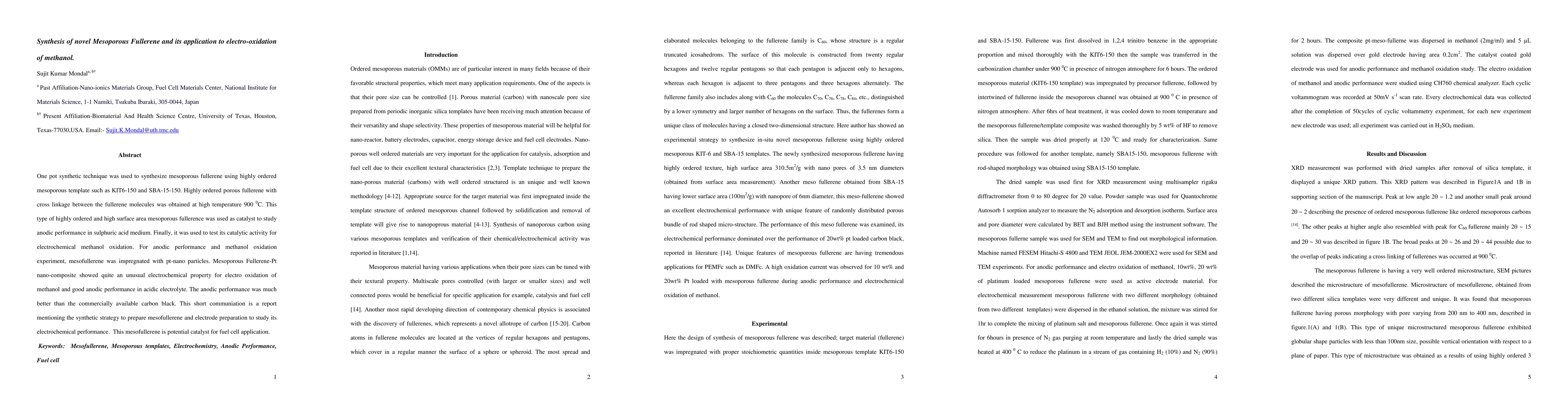 This paper reports a one-pot synthesis of mesoporous fullerene using KIT6-150 and SBA-15-150 templates, which was then impregnated with Pt-nano particles to create a mesoporous fullerene-Pt nanocomposite. The composite demonstrated superior anodic performance and catalytic activity for methanol oxidation compared to commercial carbon black, indicating potential for fuel cell applications.