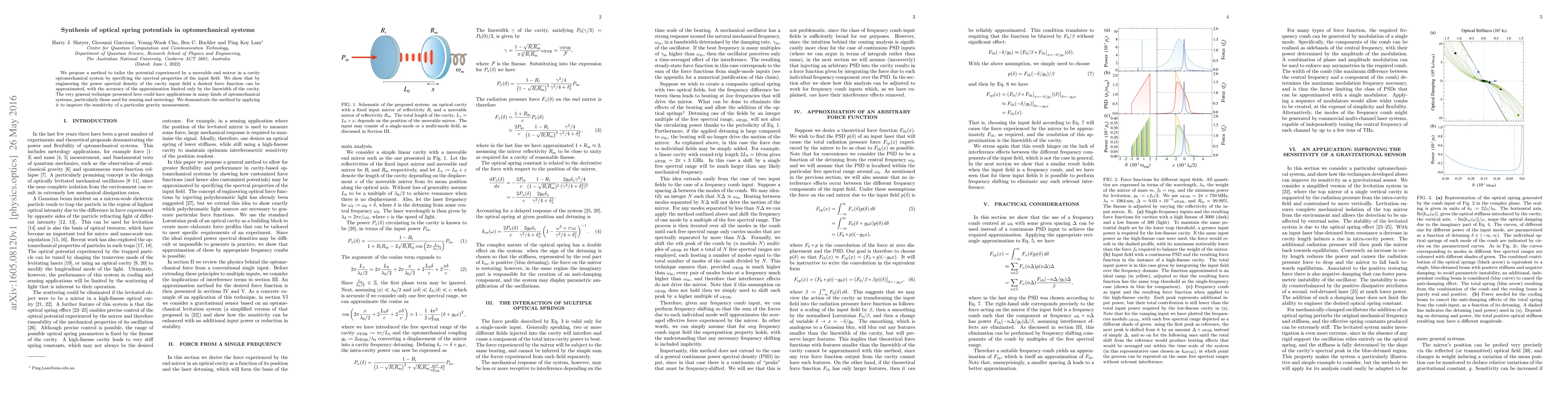 We propose a method to tailor the potential experienced by a moveable end mirror in a cavity optomechanical system by specifying the spectral properties of the input field. We show that by engineering the power spectral density of the cavity input field a desired force function can be approximated, with the accuracy of the approximation limited only by the linewidth of the cavity. The very general technique presented here could have applications in many kinds of optomechanical systems, particularly those used for sensing and metrology. We demonstrate the method by applying it to improve the sensitivity of a particular gravity measurement.