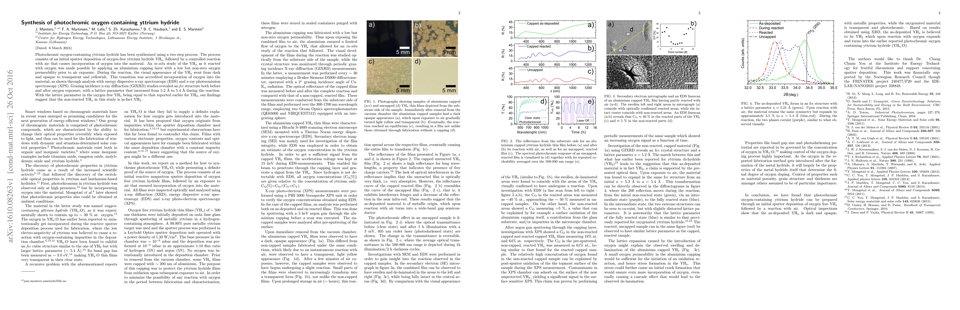 This paper details the synthesis of photochromic oxygen-containing yttrium hydride via sputter deposition followed by controlled oxygen incorporation. The study reveals a structural transition and lattice expansion from 5.2 Å to 5.4 Å, confirmed by EDS, XPS, and GIXRD.