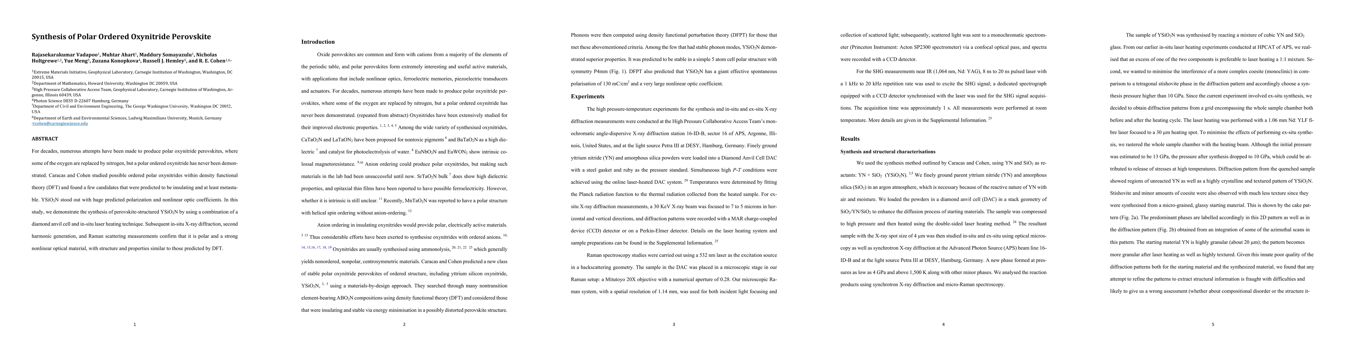 For decades, numerous attempts have been made to produce polar oxynitride perovskites, where some of the oxygen are replaced by nitrogen, but a polar ordered oxynitride has never been demonstrated. Caracas and Cohen studied possible ordered polar oxynitrides within density functional theory (DFT) and found a few candidates that were predicted to be insulating and at least metastable. YSiO2N stood out with huge predicted polarization and nonlinear optic coefficients. In this study, we demonstrate the synthesis of perovskite-structured YSiO2N by using a combination of a diamond anvil cell and in-situ laser heating technique. Subsequent in-situ X-ray diffraction, second harmonic generation, and Raman scattering measurements confirm that it is polar and a strong nonlinear optical material, with structure and properties similar to those predicted by DFT.