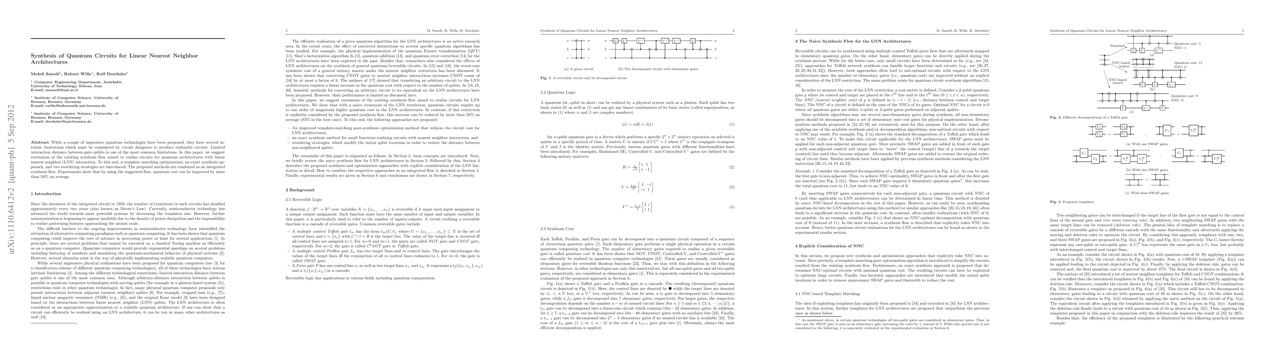 This paper proposes a new synthesis flow to create quantum circuits for linear nearest neighbor architectures, addressing the limitation of qubit interaction distance. The approach includes template matching optimization, an exact synthesis method, and reordering strategies, achieving a 50% average improvement in quantum cost.