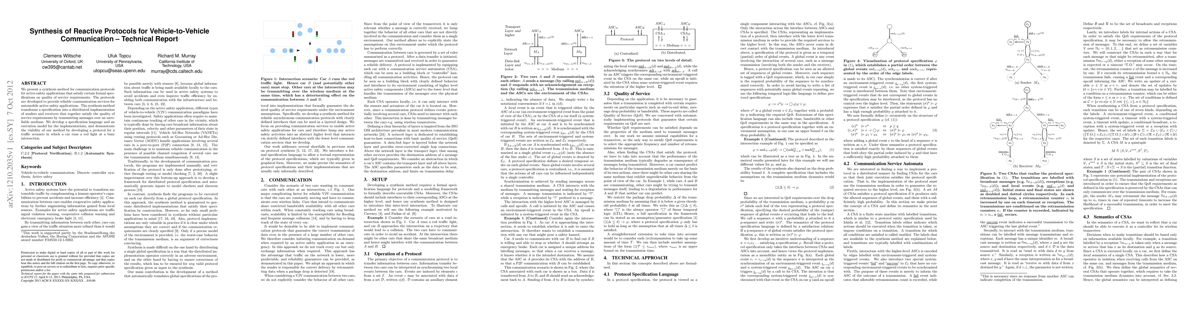 This paper proposes a synthesis method for developing communication protocols for vehicle-to-vehicle active safety applications that meet formal quality of service specifications. The method transforms specifications into distributed implementations, ensuring reliable message transmission over unreliable channels, demonstrated through a protocol for a traffic scenario involving a car running a red light.