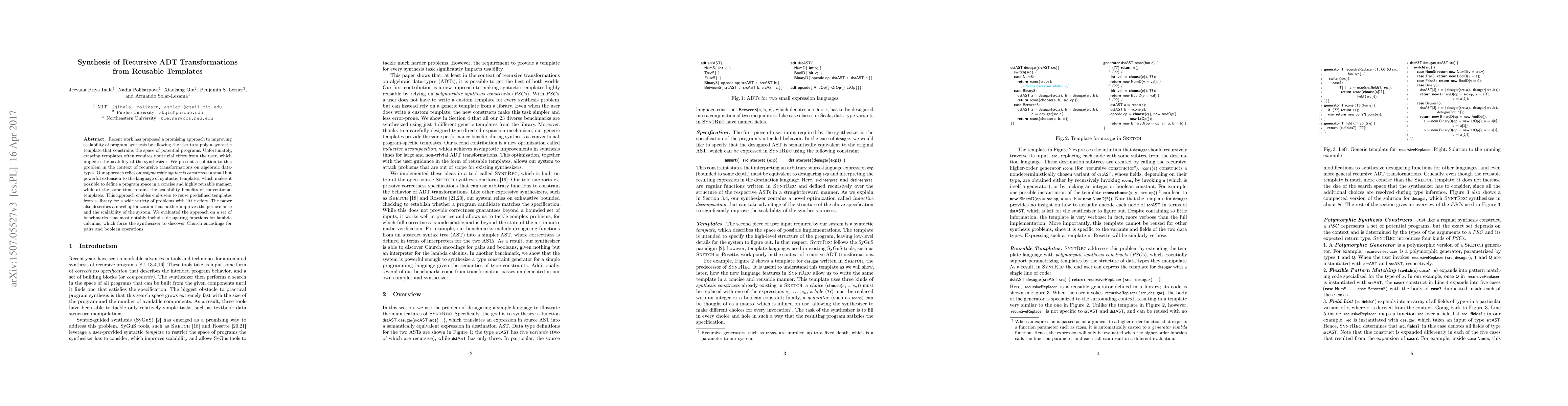 This paper proposes a method for synthesizing recursive transformations on algebraic data-types using reusable templates, leveraging polymorphic constructs to simplify template creation and enhance scalability. The approach allows end-users to easily reuse predefined templates, improving both performance and scalability, as demonstrated through benchmarks involving lambda calculus desugaring.