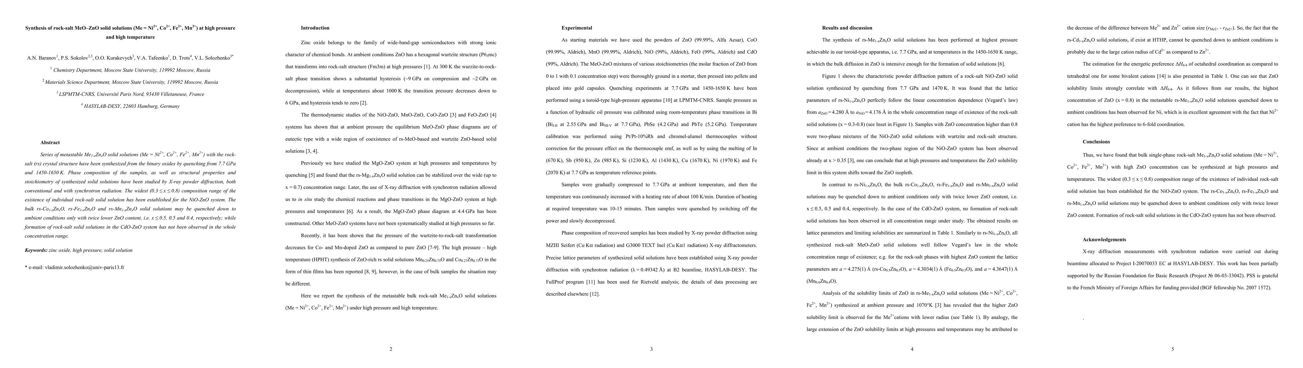 This paper reports the synthesis of metastable rock-salt Me1-xZnxO solid solutions (Me = Ni2+, Co2+, Fe2+, Mn2+) at high pressure and temperature, with the NiO-ZnO system showing the widest stable composition range. The study utilized X-ray powder diffraction to determine phase composition and structural properties.