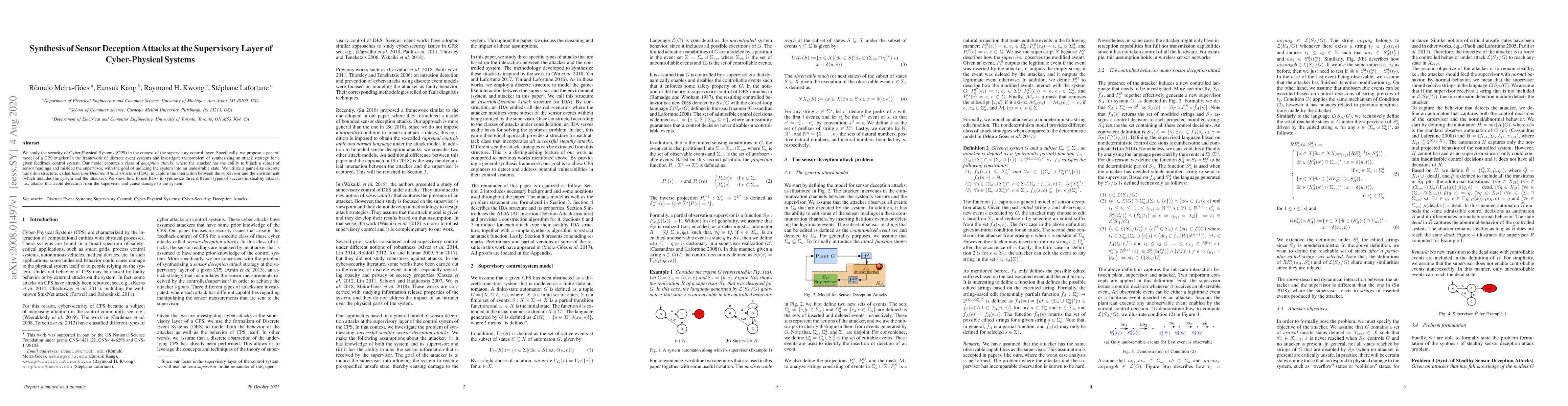 This paper proposes a model for synthesizing sensor deception attacks in the supervisory layer of Cyber-Physical Systems (CPS), focusing on stealthy attacks that can hijack sensor readings to mislead the supervisor. It introduces the Insertion-Deletion Attack (IDA) structure to model the interaction between the supervisor and the attacker, and demonstrates how to generate three types of undetectable attacks that can damage the system.