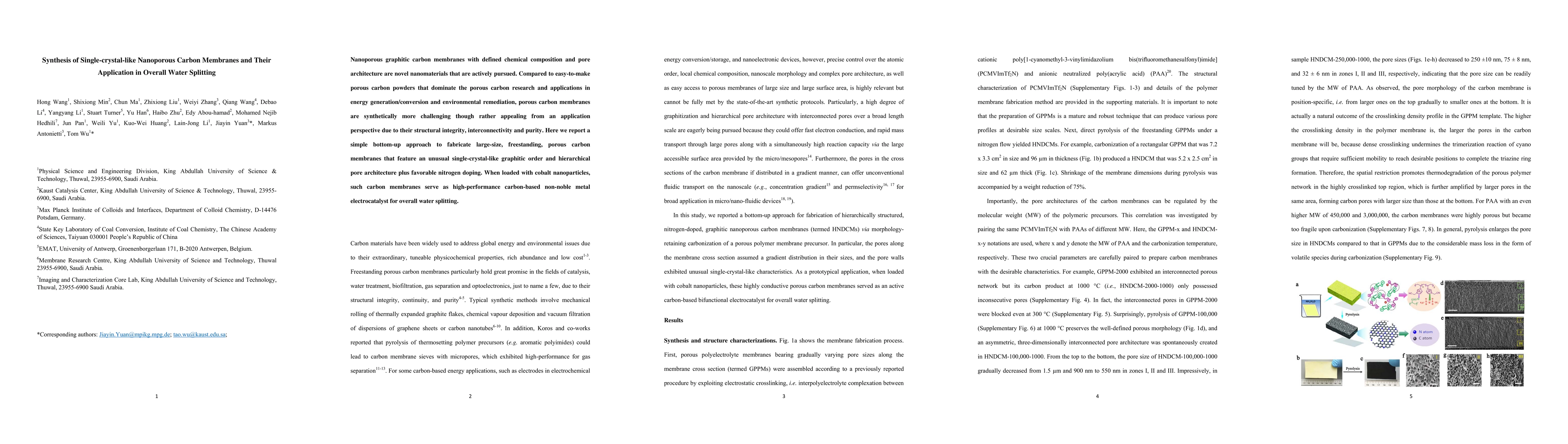 This paper presents a method for synthesizing large, freestanding nanoporous carbon membranes with a single-crystal-like graphitic order and hierarchical pore structure, which exhibit high performance as non-noble metal electrocatalysts for overall water splitting when loaded with cobalt nanoparticles. These membranes offer structural integrity and purity, surpassing conventional porous carbon powders.