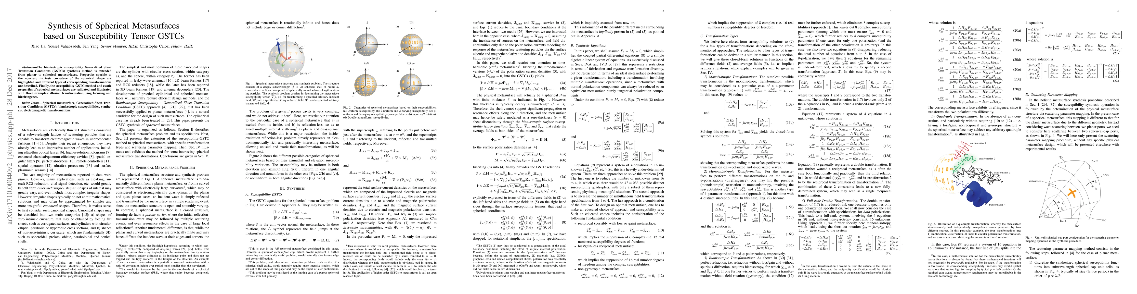 This paper extends the bianisotropic susceptibility Generalized Sheet Transition Conditions (GSTCs) synthesis method to spherical metasurfaces, highlighting properties due to intrinsic curvature and validating the method with examples of illusion transformation, ring focusing, and birefringence.