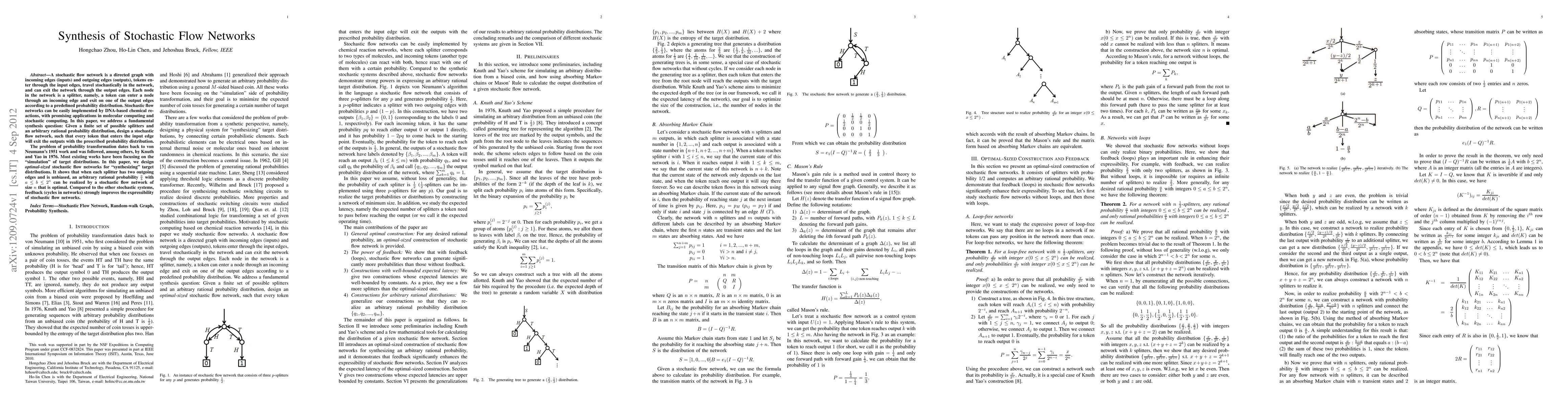 This paper addresses the synthesis of stochastic flow networks, which are directed graphs where tokens travel stochastically according to predefined probability distributions. The authors propose optimal-sized networks for realizing arbitrary rational probability distributions, demonstrating that unbiased splitters with two outgoing edges can achieve this with minimal network size. Feedback mechanisms significantly enhance the networks' expressibility.