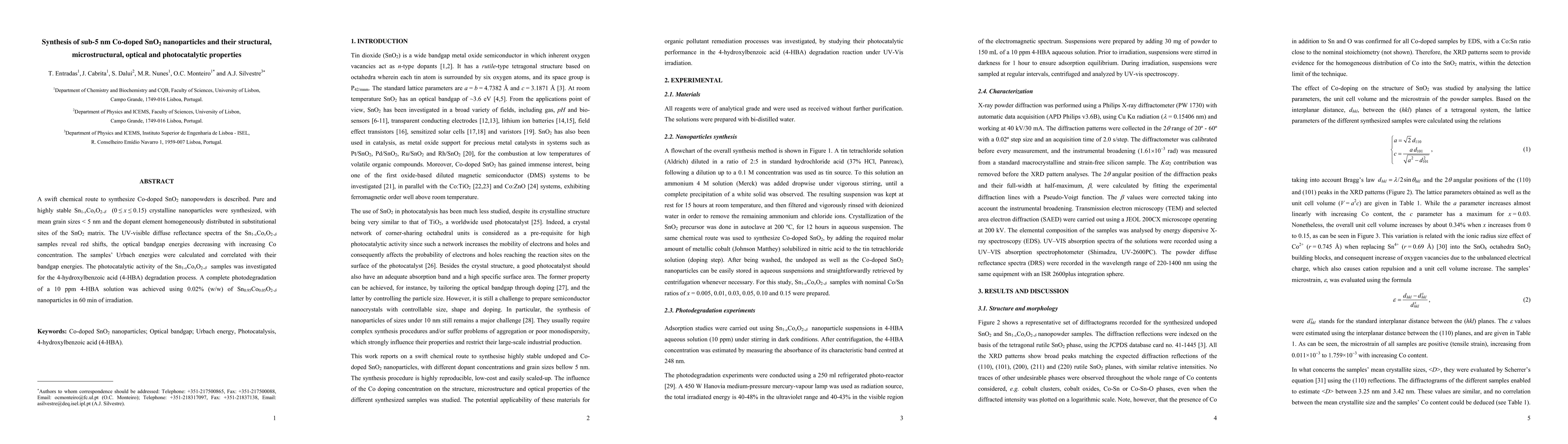 This paper details a chemical synthesis method for Co-doped SnO$_2$ nanoparticles with sizes below 5 nm, showing enhanced optical properties and high photocatalytic efficiency for degrading 4-hydroxylbenzoic acid, achieving complete degradation with minimal catalyst dosage.
