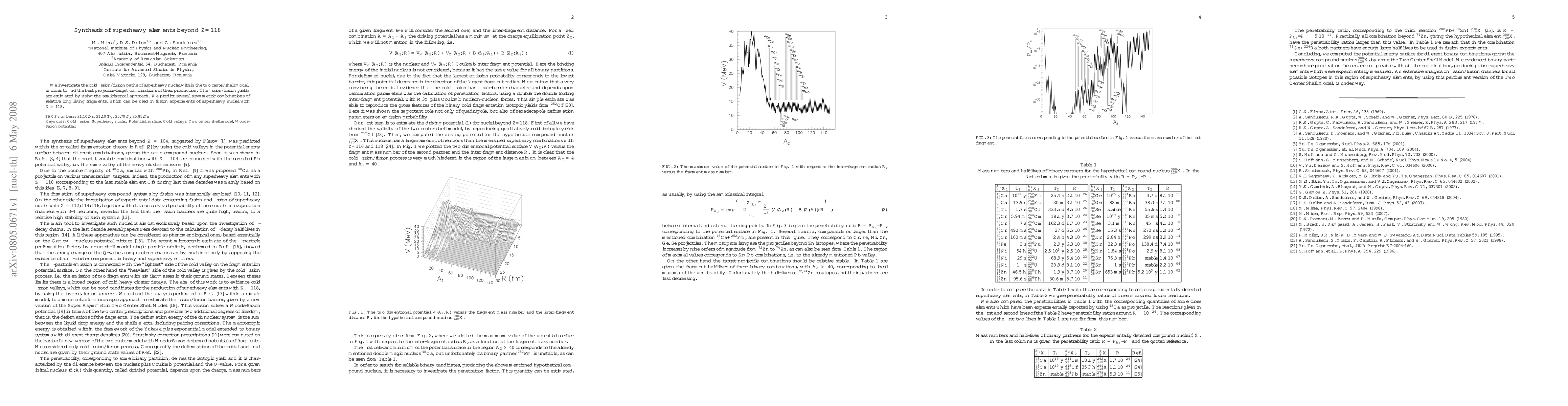 This paper explores the cold fission/fusion pathways of superheavy nuclei using the two-center shell model and semiclassical approach to identify optimal projectile-target combinations for producing elements beyond Z=118. It predicts several asymmetric, long-lived fragments suitable for fusion experiments.