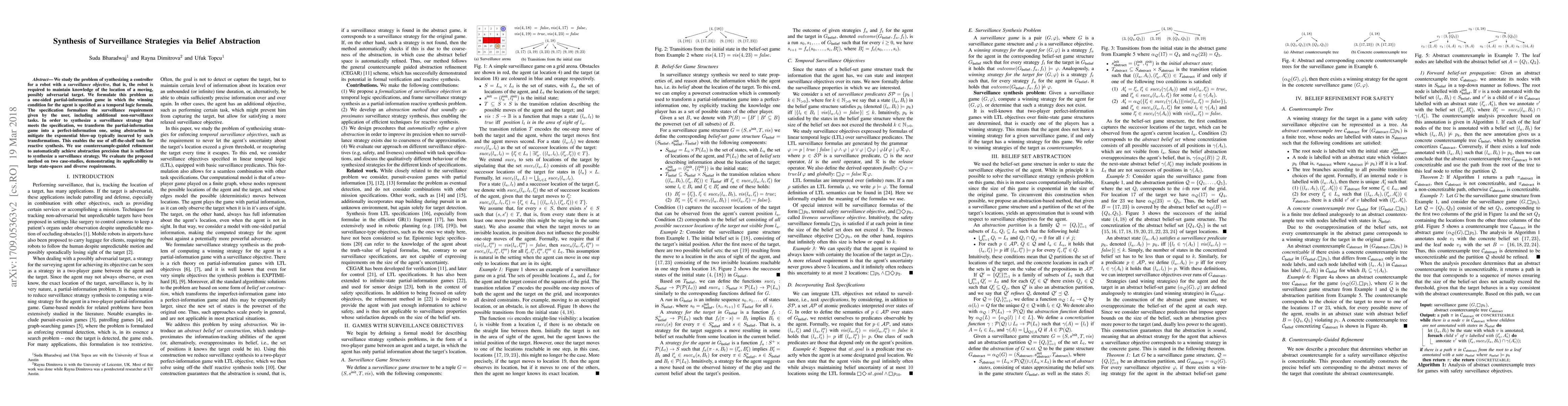 This paper presents a method for synthesizing surveillance strategies for robots using belief abstraction to transform partial-information games into perfect-information ones, enabling the use of reactive synthesis tools. The approach is evaluated on two case studies, showing its effectiveness in large state-spaces.