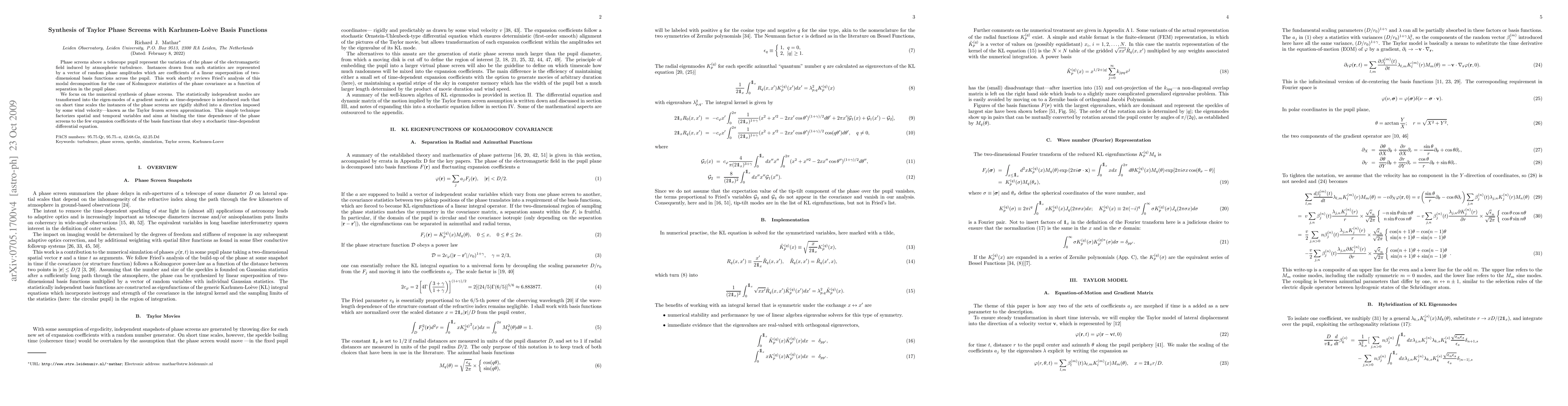 This paper discusses the numerical synthesis of Taylor phase screens using Karhunen-Loeve basis functions to model atmospheric turbulence effects on telescope pupils. It introduces the Taylor frozen screen approximation to factorize spatial and temporal variables, focusing on the time-dependent transformation of statistically independent modes into eigen-modes.