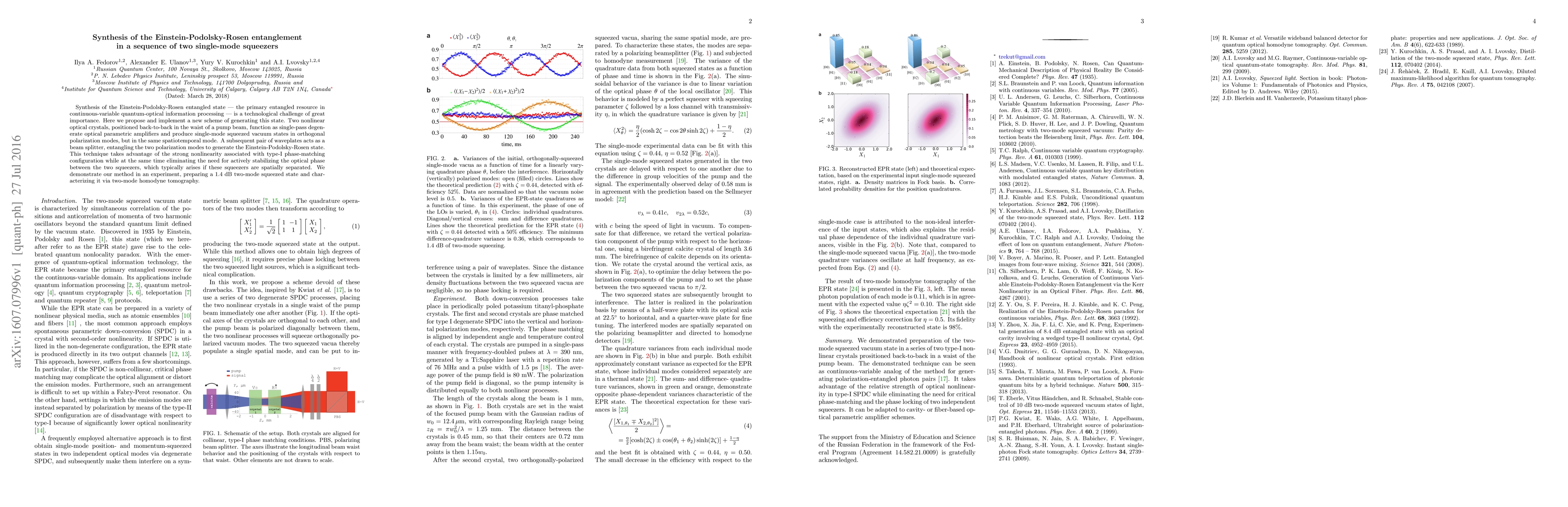 This paper proposes and demonstrates a new scheme for generating the Einstein-Podolsky-Rosen entangled state using two single-mode squeezers in a sequence, eliminating the need for optical phase stabilization. The method employs nonlinear optical crystals and waveplates to entangle squeezed vacuum states, achieving a 1.4 dB two-mode squeezed state validated through homodyne tomography.