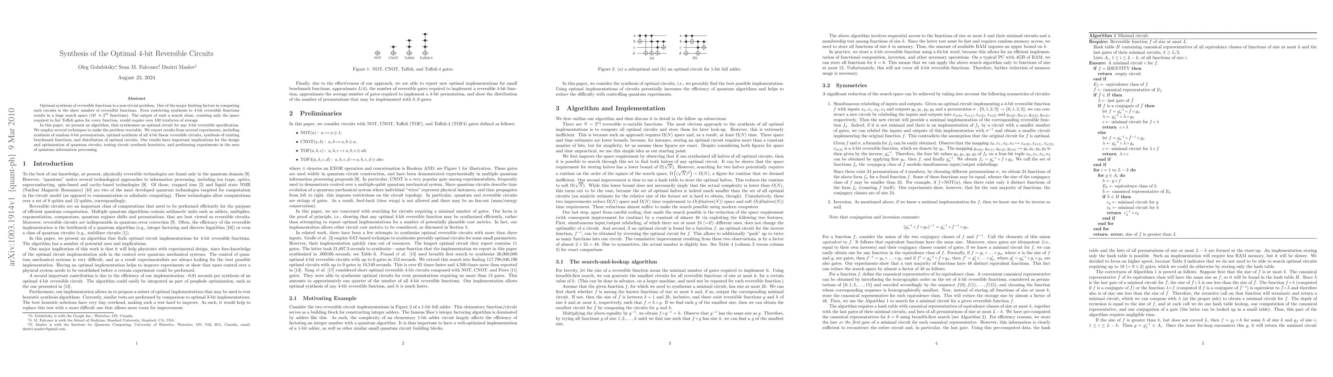 This paper introduces an algorithm for synthesizing optimal 4-bit reversible circuits, tackling the immense search space of 16! reversible functions. The authors employ various techniques to manage this complexity, reporting successful synthesis of random permutations, linear circuits, and benchmark functions with significant implications for quantum circuit design and optimization.
