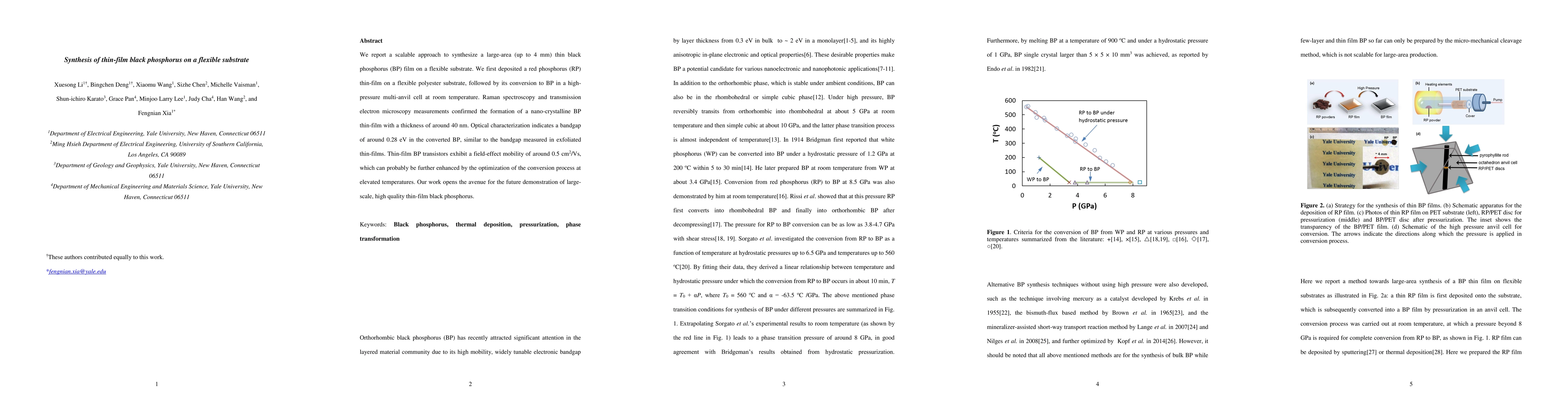 The paper introduces a novel approach for synthesizing thin-film black phosphorus on flexible substrates using high-pressure conversion of red phosphorus films, enabling potential applications in flexible electronics.
