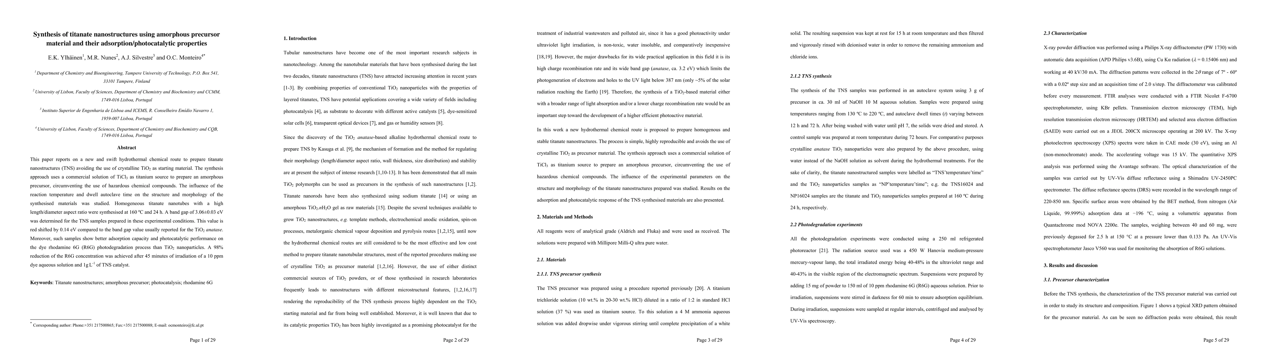 This paper presents a hydrothermal method for synthesizing titanate nanostructures from an amorphous precursor, achieving high-aspect-ratio nanotubes at 160°C and 24 h. These titanate nanostructures exhibit a red-shifted band gap and superior adsorption and photocatalytic performance for rhodamine 6G degradation compared to TiO2 nanoparticles.