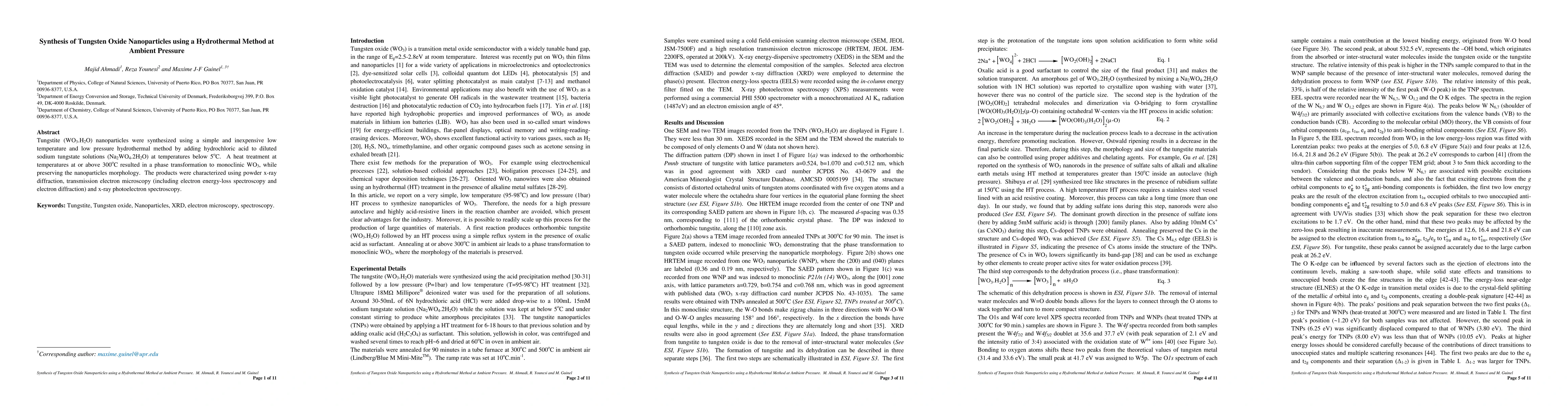 This paper details the synthesis of tungstite (WO3.H2O) nanoparticles via a low-cost hydrothermal method at ambient pressure, followed by a phase transformation to monoclinic WO3 through heat treatment at 300°C or higher, while maintaining nanoparticle morphology. Characterization techniques included powder x-ray diffraction, transmission electron microscopy, and x-ray photoelectron spectroscopy.