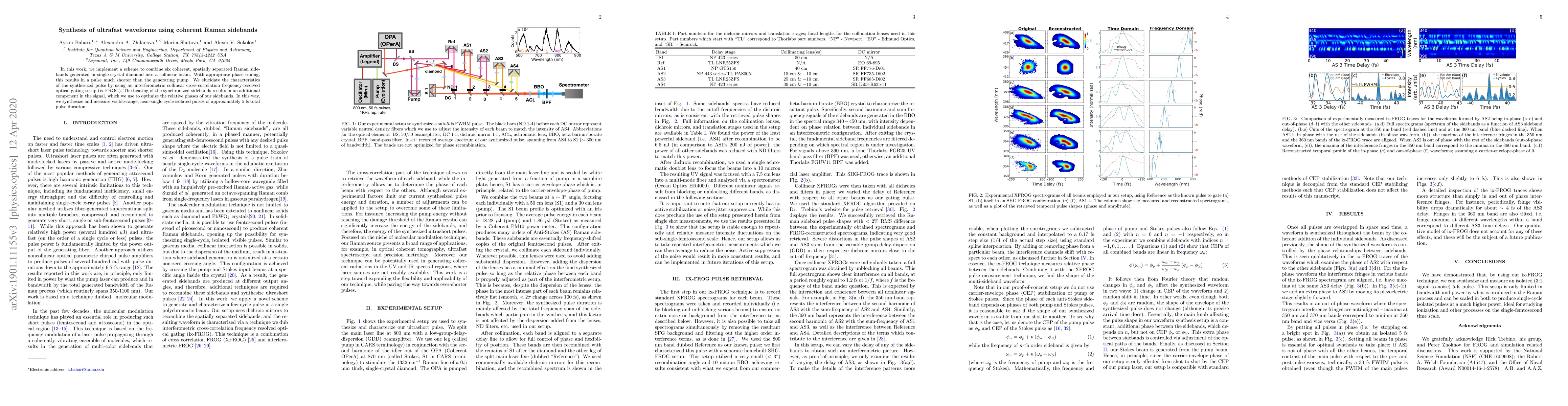 This paper details a method to synthesize ultrafast, near-single cycle pulses by combining six coherent Raman sidebands in single-crystal diamond, achieving a pulse duration of approximately 5 fs. The technique utilizes interferometric collinear cross-correlation frequency-resolved optical gating to optimize the sideband phases and characterize the resulting pulse.