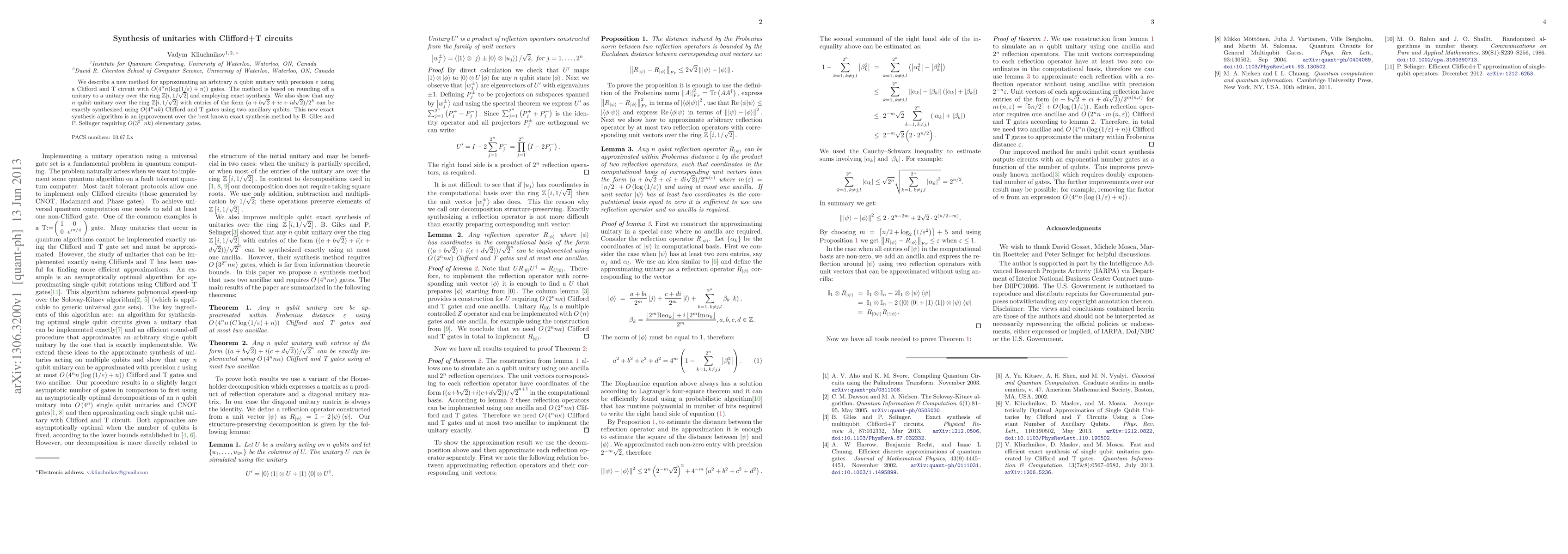 This paper introduces a novel method for approximating an arbitrary $n$ qubit unitary using Clifford+T circuits with significantly fewer gates, achieving $O(4^{n}n(\log(1/\varepsilon)+n))$ complexity. It also presents an exact synthesis algorithm for specific unitaries over the ring $\mathbb{Z}[i,1/\sqrt{2}]$, requiring $O(4^{n}nk)$ gates, outperforming previous methods.