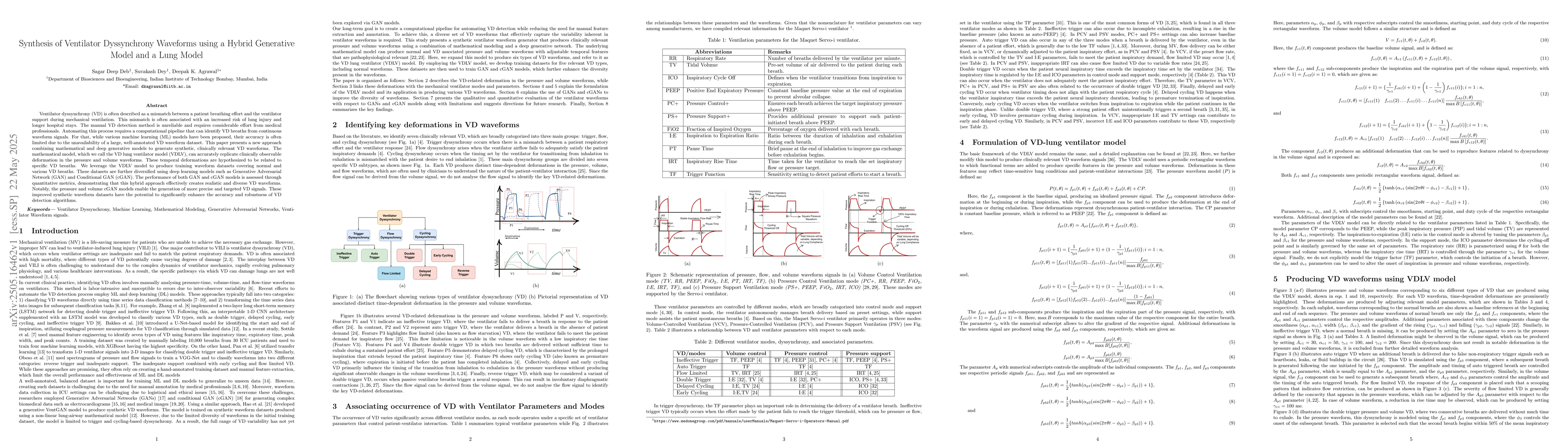 Researchers developed a hybrid generative model to create synthetic ventilation dyssynchrony waveforms, which can improve the accuracy of automation in detecting this condition during mechanical ventilation. The model combines mathematical and deep learning techniques to generate realistic and diverse waveforms with potential for enhanced VD detection algorithms.
