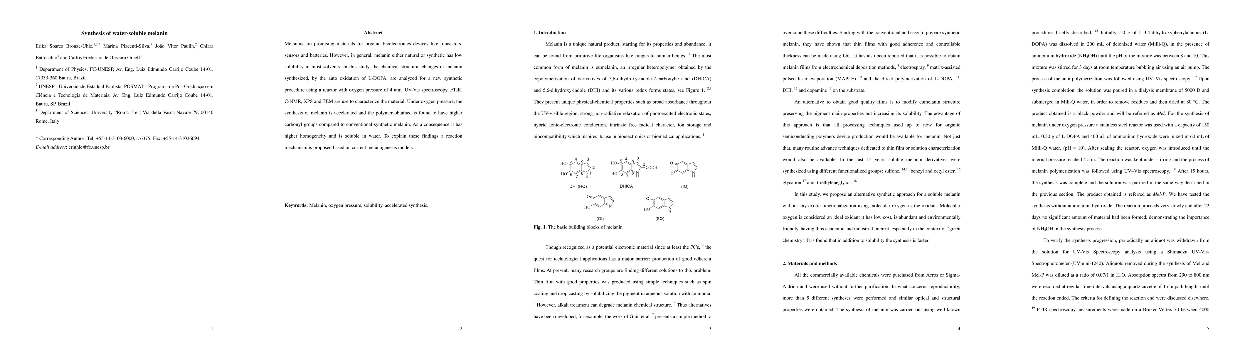 Melanins are promising materials for organic bioelectronics devices like transistors, sensors and batteries. However, in general, melanin either natural or synthetic has low solubility in most solvents. In this study, the chemical structural changes of melanin synthesized, by the auto oxidation of L-DOPA, are analyzed for a new synthetic procedure using a reactor with oxygen pressure of 4 atm. UV-Vis spectroscopy, FTIR, C-NMR, XPS and TEM are use to characterize the material. Under oxygen pressure, the synthesis of melanin is accelerated and the polymer obtained is found to have higher carbonyl groups compared to conventional synthetic melanin. As a consequence it has higher homogeneity and is soluble in water. To explain these findings a reaction mechanism is proposed based on current melanogenesis models.