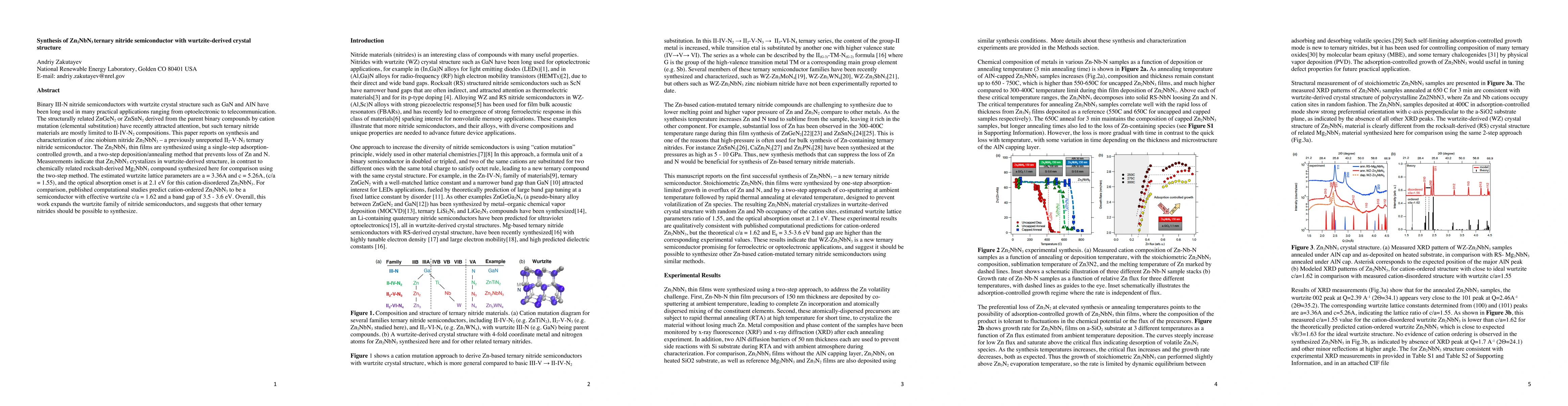 This paper reports the synthesis of the previously unreported Zn2NbN3 ternary nitride semiconductor with a wurtzite-derived crystal structure, expanding the family of nitride semiconductors. The material was synthesized using adsorption-controlled growth and a deposition/annealing method, showing a band gap of 2.1 eV and lattice parameters of a = 3.36A and c = 5.26A.