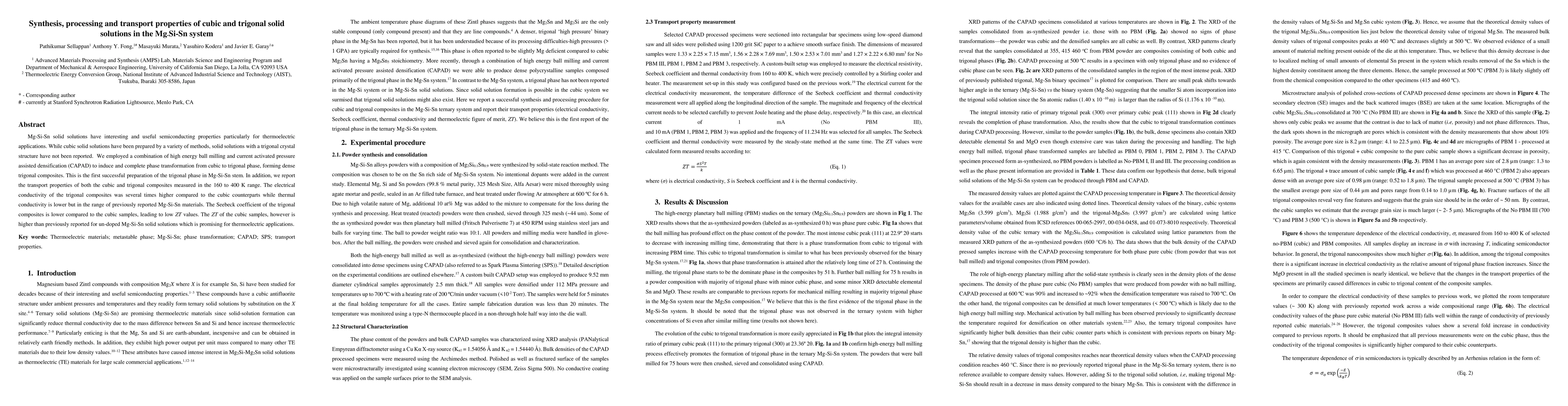 Mg-Si-Sn solid solutions have interesting and useful semiconducting properties particularly for thermoelectric applications. While cubic solid solutions have been prepared by a variety of methods, solid solutions with a trigonal crystal structure have not been reported. We employed a combination of high energy ball milling and current activated pressure assisted densification (CAPAD) to induce and complete phase transformation from cubic to trigonal phase, forming dense trigonal composites. This is the first successful preparation of the trigonal phase in Mg-Si-Sn stem. In addition, we report the transport properties of both the cubic and trigonal composites measured in the 160 to 400 K range. The electrical conductivity of the trigonal composites was several times higher compared to the cubic counterparts while thermal conductivity is lower but in the range of previously reported Mg-Si-Sn materials. The Seebeck coefficient of the trigonal composites is lower compared to the cubic samples, leading to low ZT values. The ZT of the cubic samples, however is higher than previously reported for un-doped Mg-Si-Sn solid solutions which is promising for thermoelectric applications.