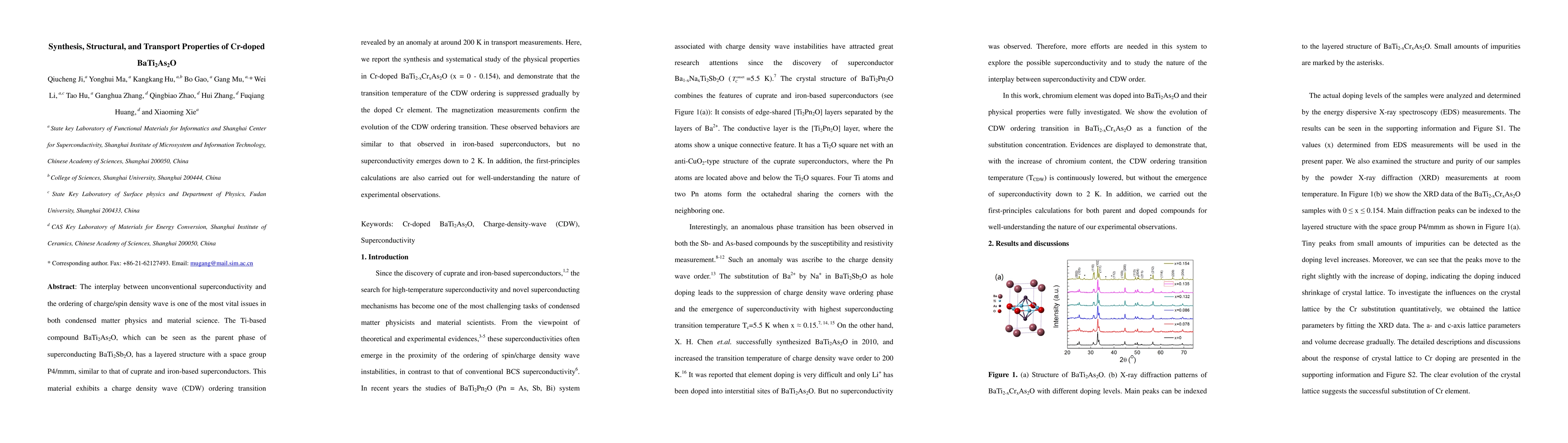 This study investigates Cr-doped BaTi_2As_2O, revealing a suppression of charge density wave ordering with increasing Cr concentration, akin to iron-based superconductors, but without inducing superconductivity down to 2 K. First-principles calculations support the observed physical property changes.