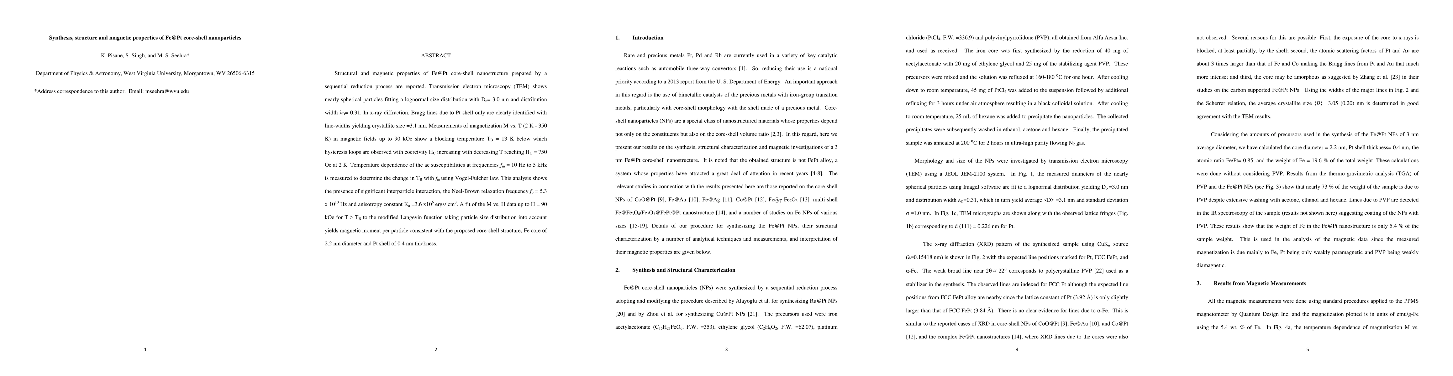 This paper reports the synthesis and magnetic properties of Fe@Pt core-shell nanoparticles, revealing a blocking temperature of 13 K and significant interparticle interaction, with a core-shell structure of 2.2 nm Fe core and 0.4 nm Pt shell. The coercivity increases with decreasing temperature, reaching 750 Oe at 2 K.