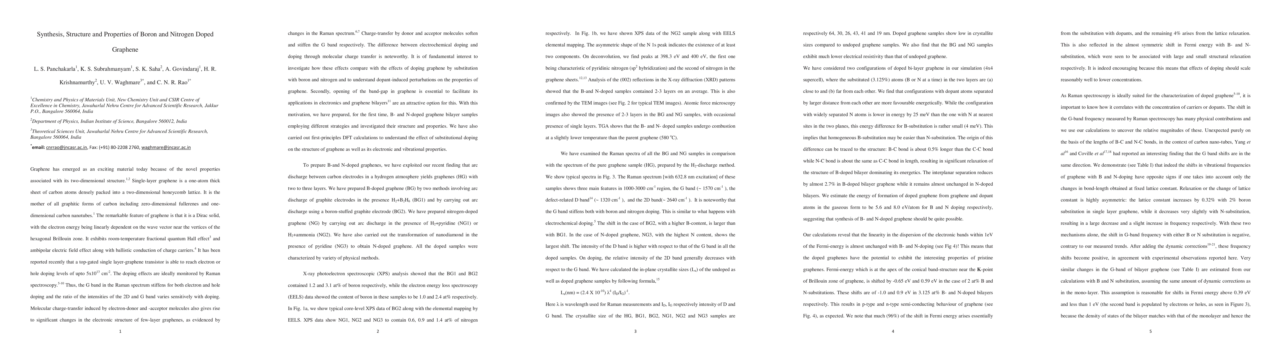 Two-dimensional graphene exhibits many fascinating properties such as ballistic electronic conduction and quantum Hall effect at room temperature.1-4 Graphene doped electrochemically or through charge-transfer with electron-donor and -acceptor molecules,5-7 shows marked changes in electronic structure, with characteristic signatures in the Raman spectra.5-10 Substitutional doping, universally used in tuning properties of semiconductors, could be a powerful tool to control the electronic properties of graphene. Here, we present the structure and properties of boron and nitrogen doped graphenes, obtained by more than one method involving arc discharge in appropriate gaseous atmosphere, by using modified graphite electrode or by the transformation of nano-diamond. Using a combination of experiment and firstprinciples theory, we demonstrate systematic changes in the carrier-concentration and electronic structure of graphenes with B/N-doping, accompanied by stiffening of the Gband and intensification of the defect related D-band in the Raman spectra. Such n/p - type graphenes obtained without external fields or chemical agents should find device applications.