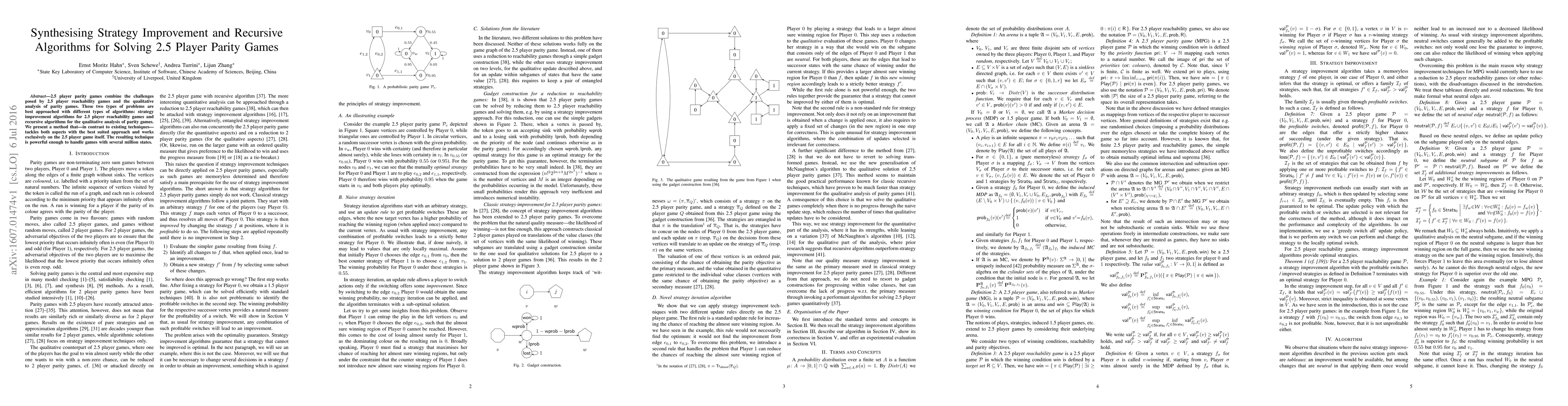 This paper proposes a novel method combining strategy improvement and recursive algorithms to solve 2.5 player parity games efficiently. Unlike existing techniques, it directly addresses both reachability and qualitative analysis within the game itself, achieving scalability for games with millions of states.