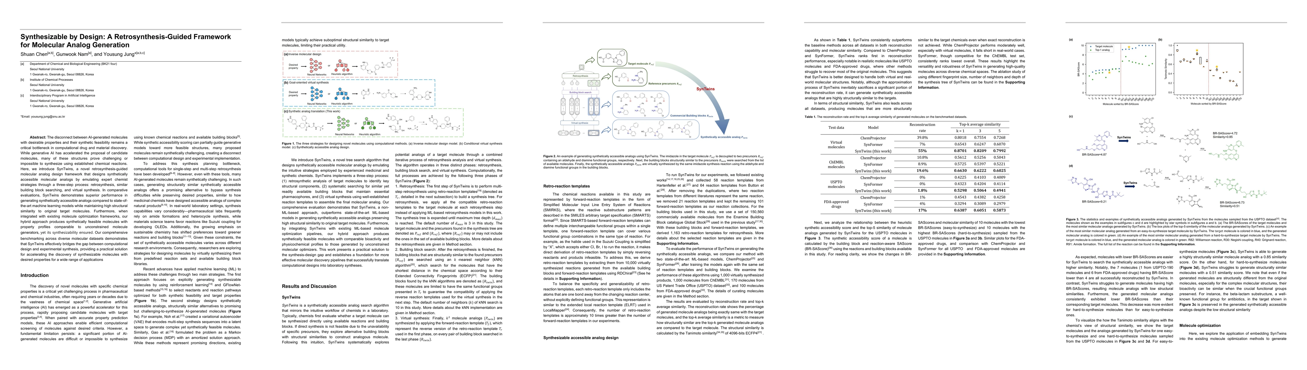 The paper introduces SynTwins, a framework that generates synthetically feasible molecular analogs by mimicking chemist strategies. It outperforms existing models in creating accessible analogs while maintaining high similarity to target molecules, bridging the gap between computational design and experimental synthesis.
