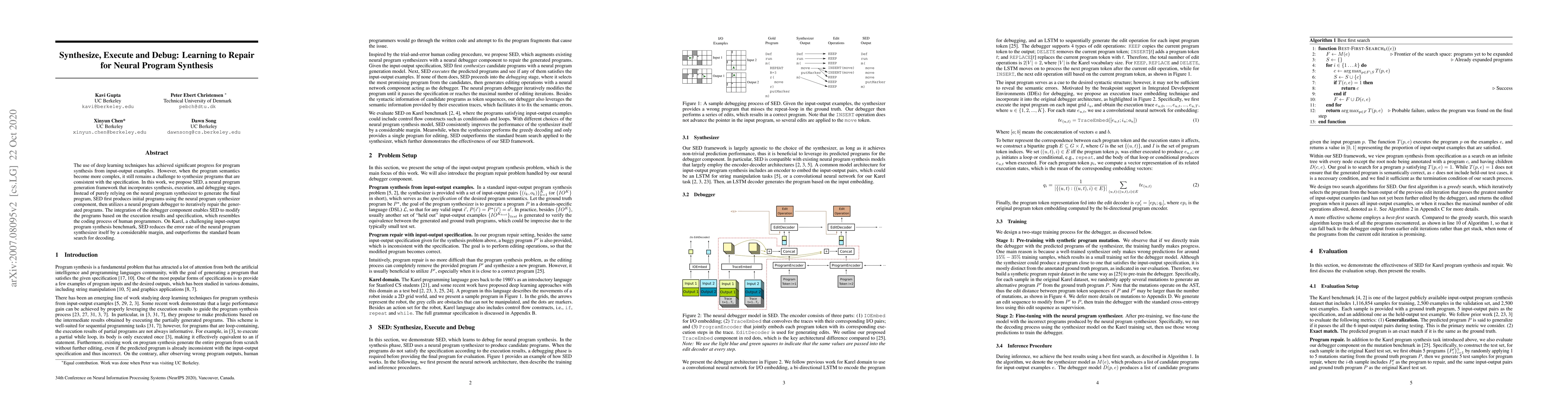 Abstract: SED, a neural program generation framework, combines synthesis, execution, and debugging to create programs consistent with specifications. It iteratively repairs initial programs generated by a neural synthesizer using a neural debugger, achieving lower error rates and outperforming standard beam search on the Karel benchmark.