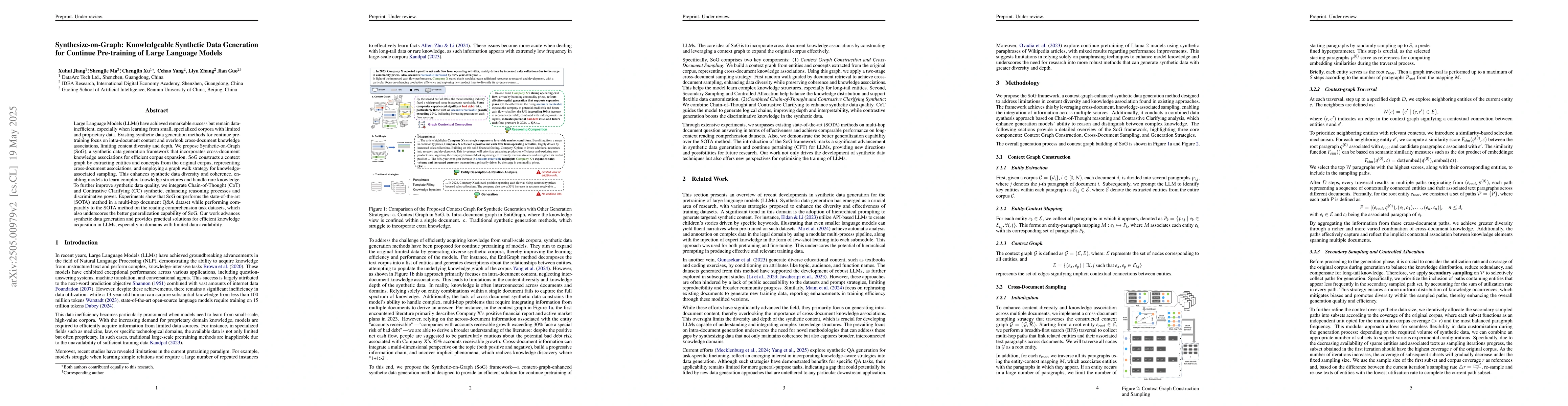The paper proposes Synthetic-on-Graph (SoG), a framework for generating synthetic data that incorporates cross-document knowledge associations to enhance large language model pre-training. SoG constructs a context graph to represent these associations and employs a graph walk strategy for synthetic data generation, improving diversity and coherence.