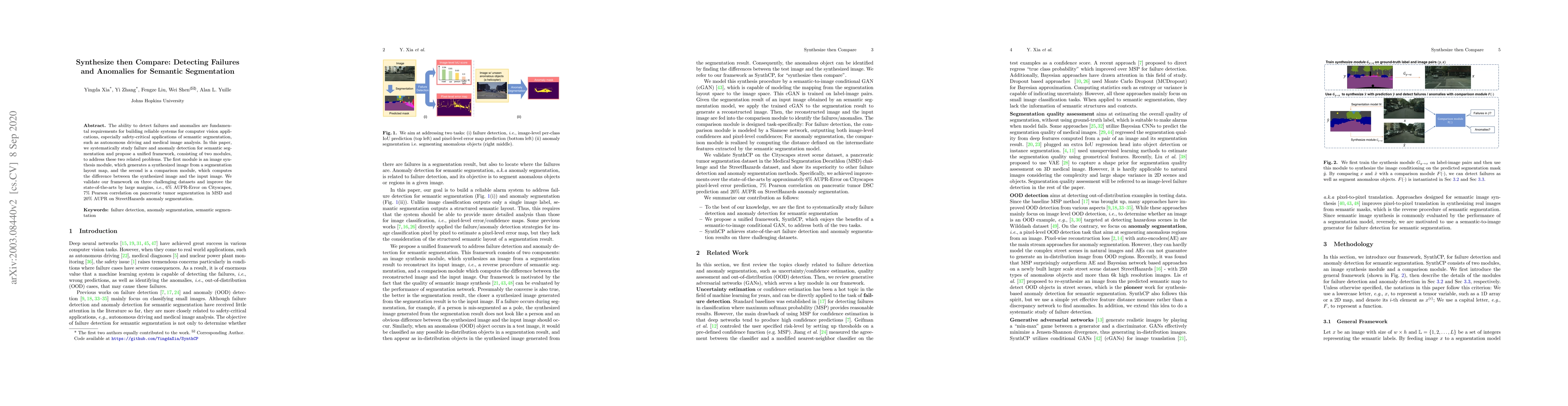 The ability to detect failures and anomalies are fundamental requirements for building reliable systems for computer vision applications, especially safety-critical applications of semantic segmentation, such as autonomous driving and medical image analysis. In this paper, we systematically study failure and anomaly detection for semantic segmentation and propose a unified framework, consisting of two modules, to address these two related problems. The first module is an image synthesis module, which generates a synthesized image from a segmentation layout map, and the second is a comparison module, which computes the difference between the synthesized image and the input image. We validate our framework on three challenging datasets and improve the state-of-the-arts by large margins, \emph{i.e.}, 6% AUPR-Error on Cityscapes, 7% Pearson correlation on pancreatic tumor segmentation in MSD and 20% AUPR on StreetHazards anomaly segmentation.