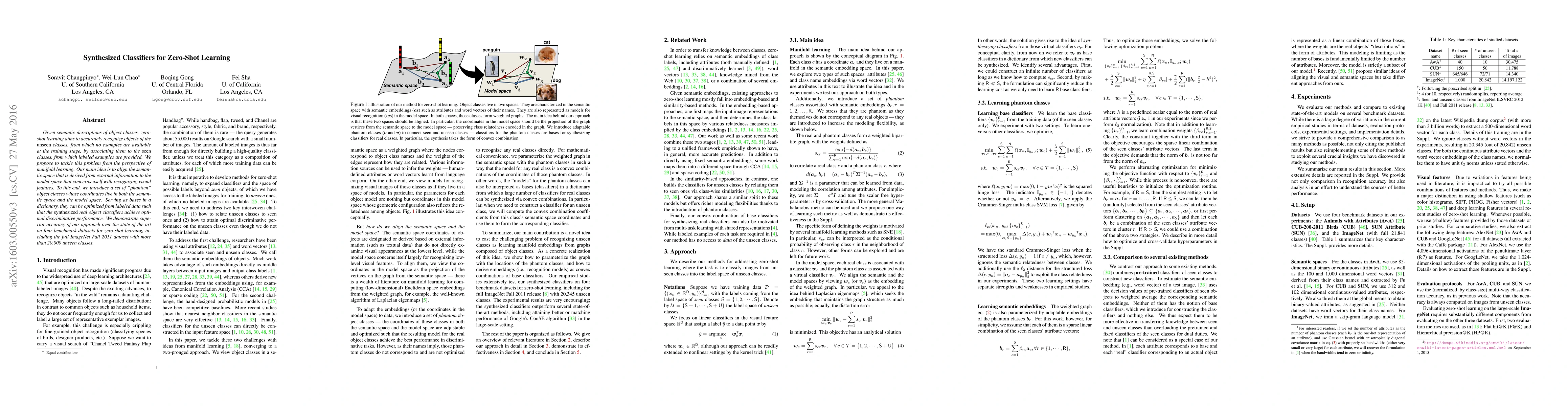 This paper proposes a novel zero-shot learning approach using manifold learning to recognize unseen object classes by aligning semantic and visual feature spaces. It introduces "phantom" object classes to optimize classifiers, achieving superior accuracy on benchmark datasets, including ImageNet.