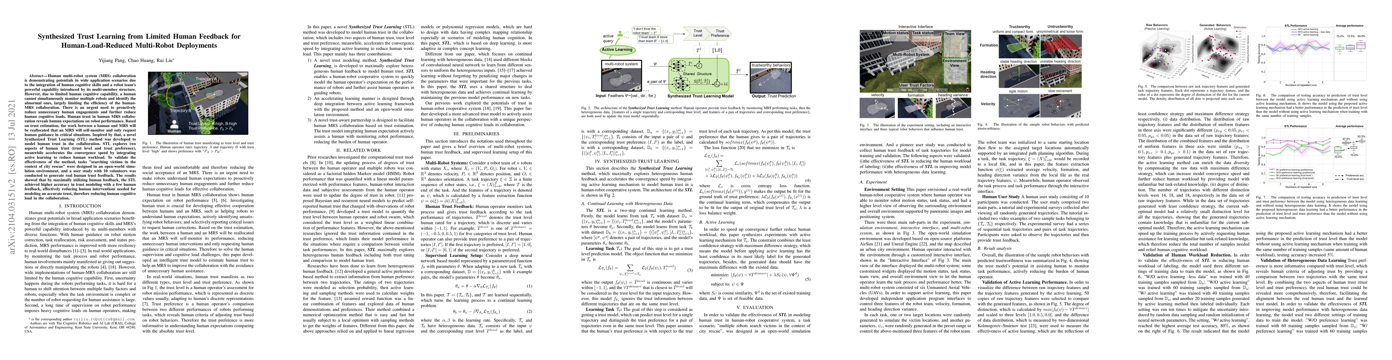 This paper proposes a Synthesized Trust Learning (STL) method to model human trust in multi-robot system (MRS) collaboration, aiming to reduce human cognitive load by minimizing unnecessary human engagements. The STL method effectively models both trust level and preference, leveraging active learning to accelerate the convergence speed, thereby reducing human interventions and cognitive load during city rescue simulations.