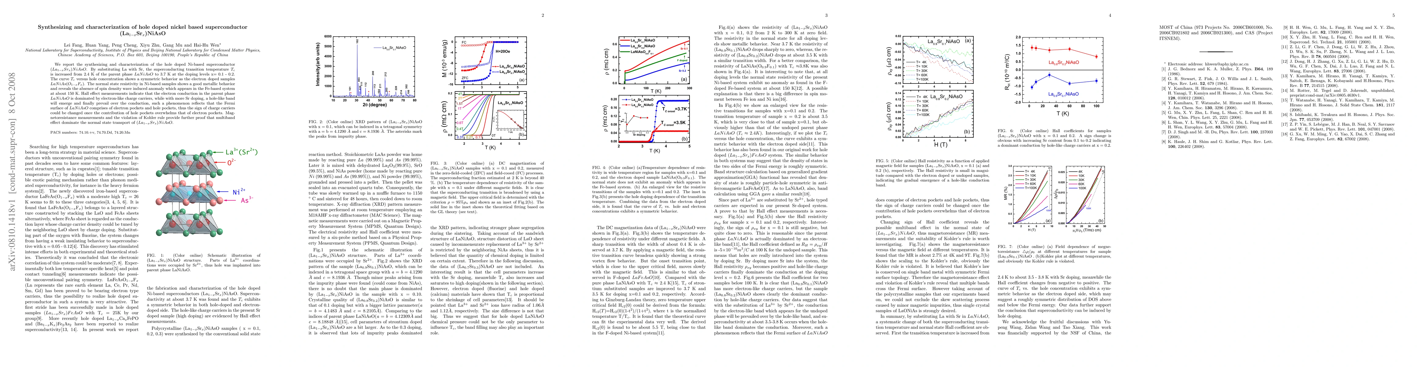 This paper synthesizes and characterizes hole doped nickel-based superconductor ($La_{1-x}Sr_{x})NiAsO$, finding that $T_c$ increases from 2.4 K to 3.7 K with Sr doping. The study reveals a multiband effect and a transition from electron to hole conduction with increased Sr doping, indicating the presence of both electron and hole pockets in the Fermi surface.