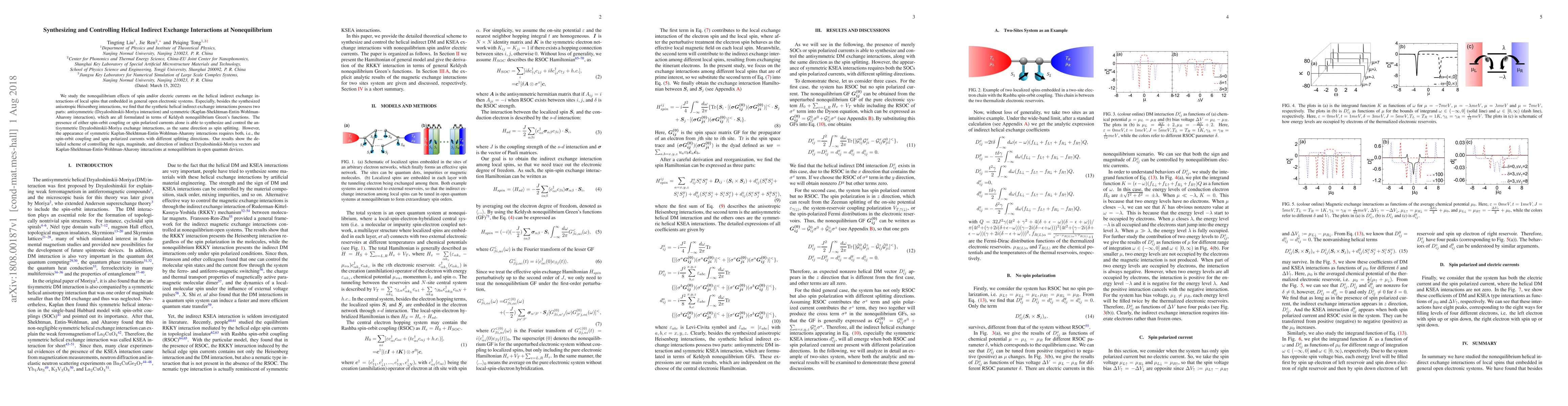This paper explores how spin and electric currents influence helical indirect exchange interactions in open electronic systems, revealing the synthesis and control of both antisymmetric Dzyaloshinskii-Moriya and symmetric Kaplan-Shekhtman-Entin-Wohlman-Aharony interactions through nonequilibrium effects. The study provides a detailed scheme for manipulating the sign, magnitude, and direction of these interactions via spin-orbit coupling and spin-polarized currents.