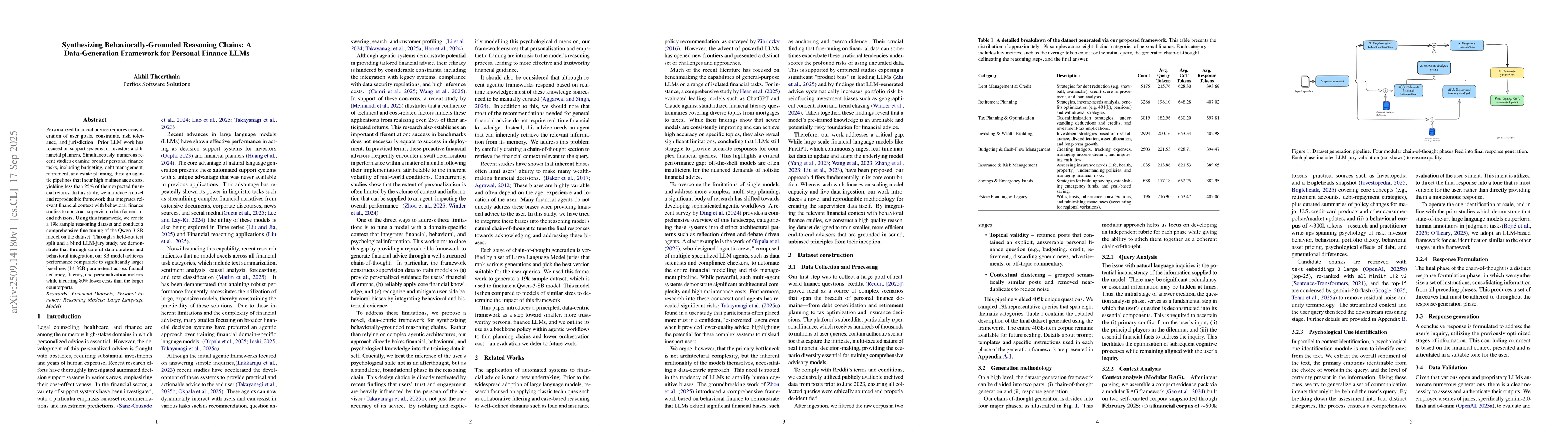 The work introduces a parameter-efficient financial advisory framework combining rule-based grounding, lightweight calculation checks, and structured reasoning pipelines for personal finance tasks.