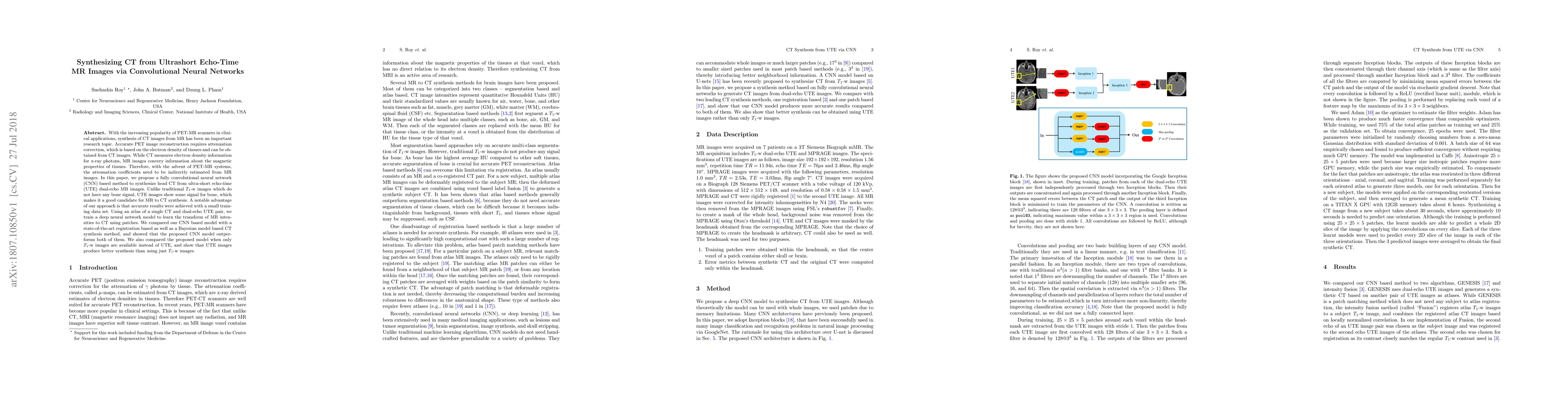 This research paper proposes a convolutional neural network (CNN) method to synthesize CT images from ultrashort echo-time (UTE) MR images, which is crucial for PET-MR systems to provide accurate attenuation correction. The study demonstrates that UTE images, which retain some bone signal, yield better results compared to traditional $T_1$-weighted images, and the CNN model outperforms existing registration and Bayesian methods.