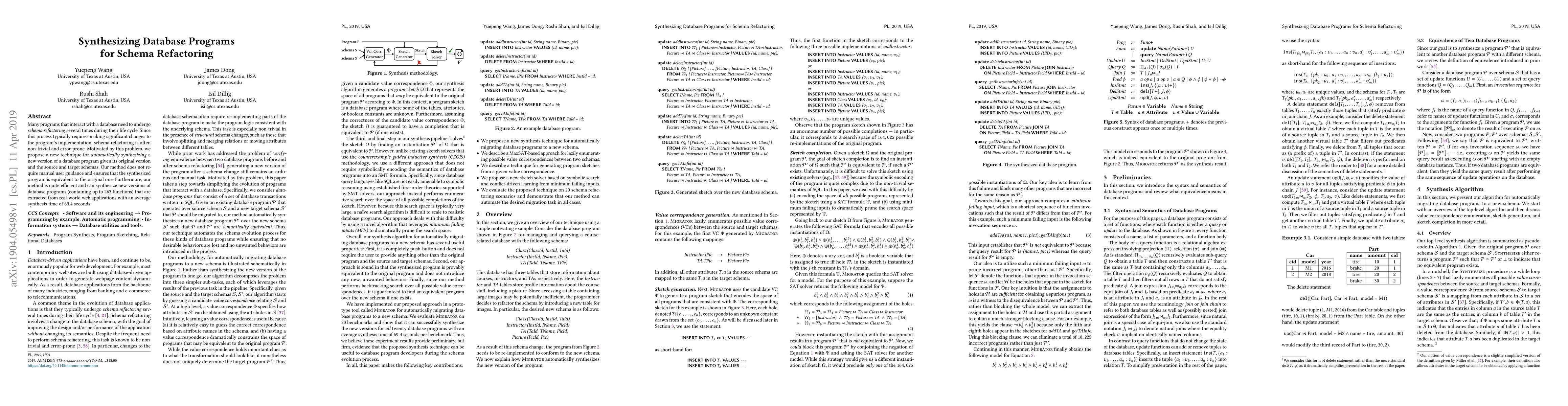 The paper proposes a technique for automatically synthesizing a new version of a database program given its original version and source and target schemas, without manual user guidance. It ensures the synthesized program is equivalent to the original one and is efficient, synthesizing programs with up to 263 functions in an average of 69.4 seconds.